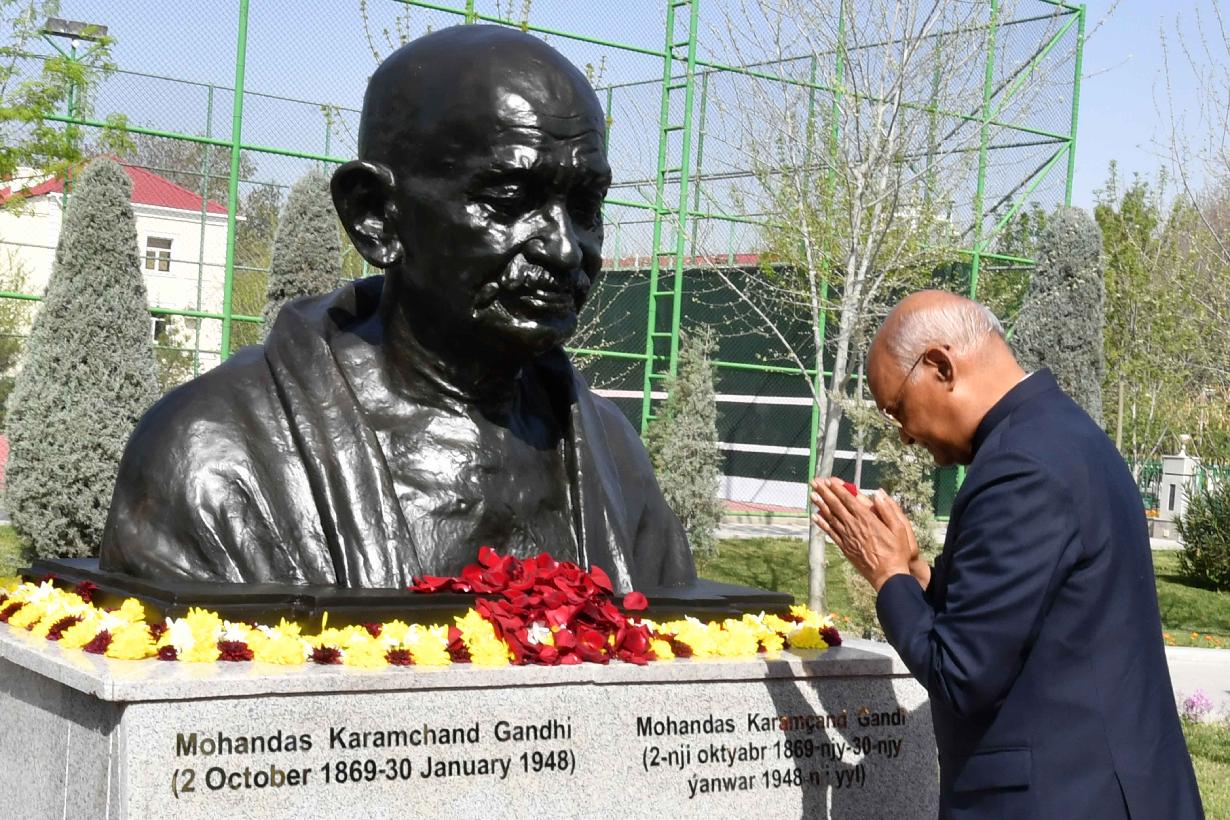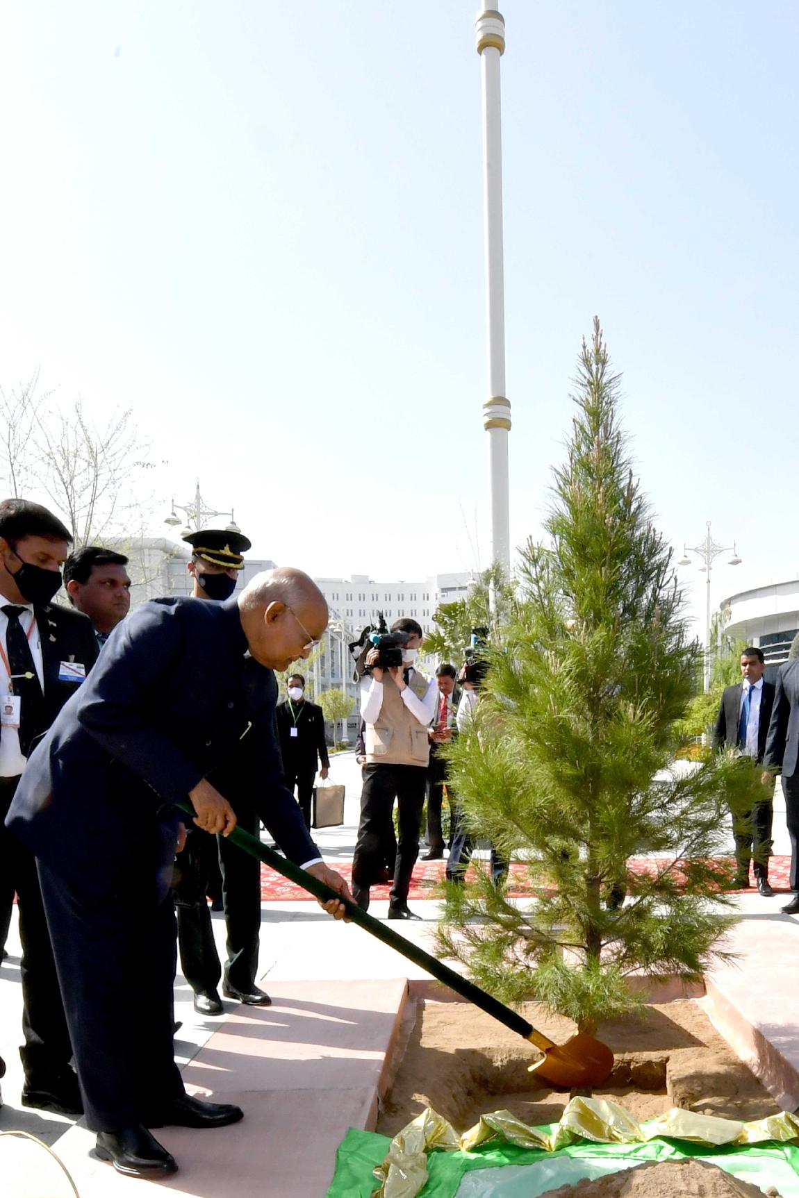 | Caption: | The President of India, Shri Ram Nath Kovind paid floral tributes at the bust of Mahatma Gandhi and also planted a sapling at the Bagtyyarlyk Sports Complex, in Ashgabat, Turkmenistan on April 03, 2022. |