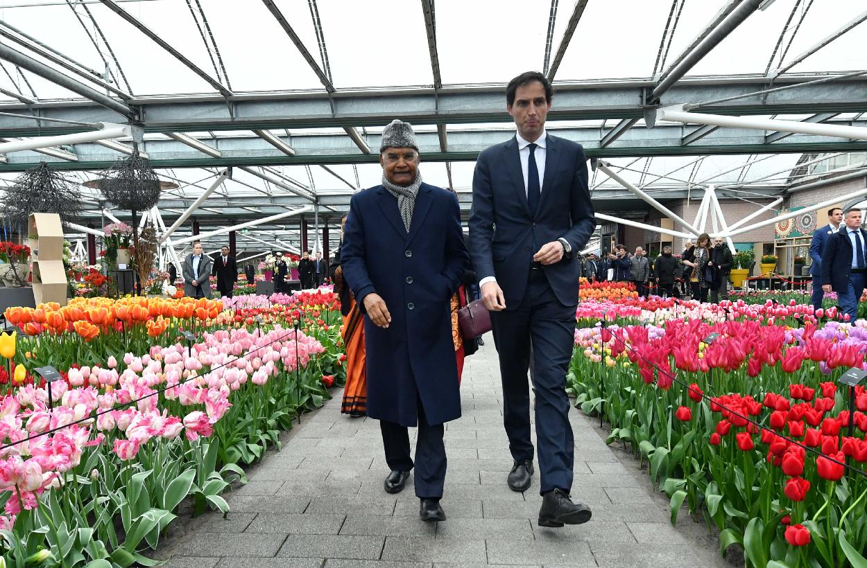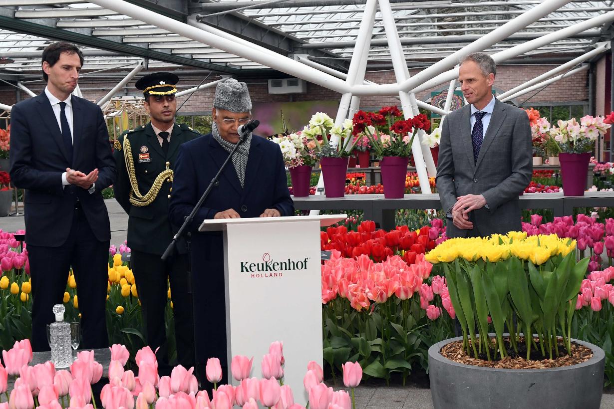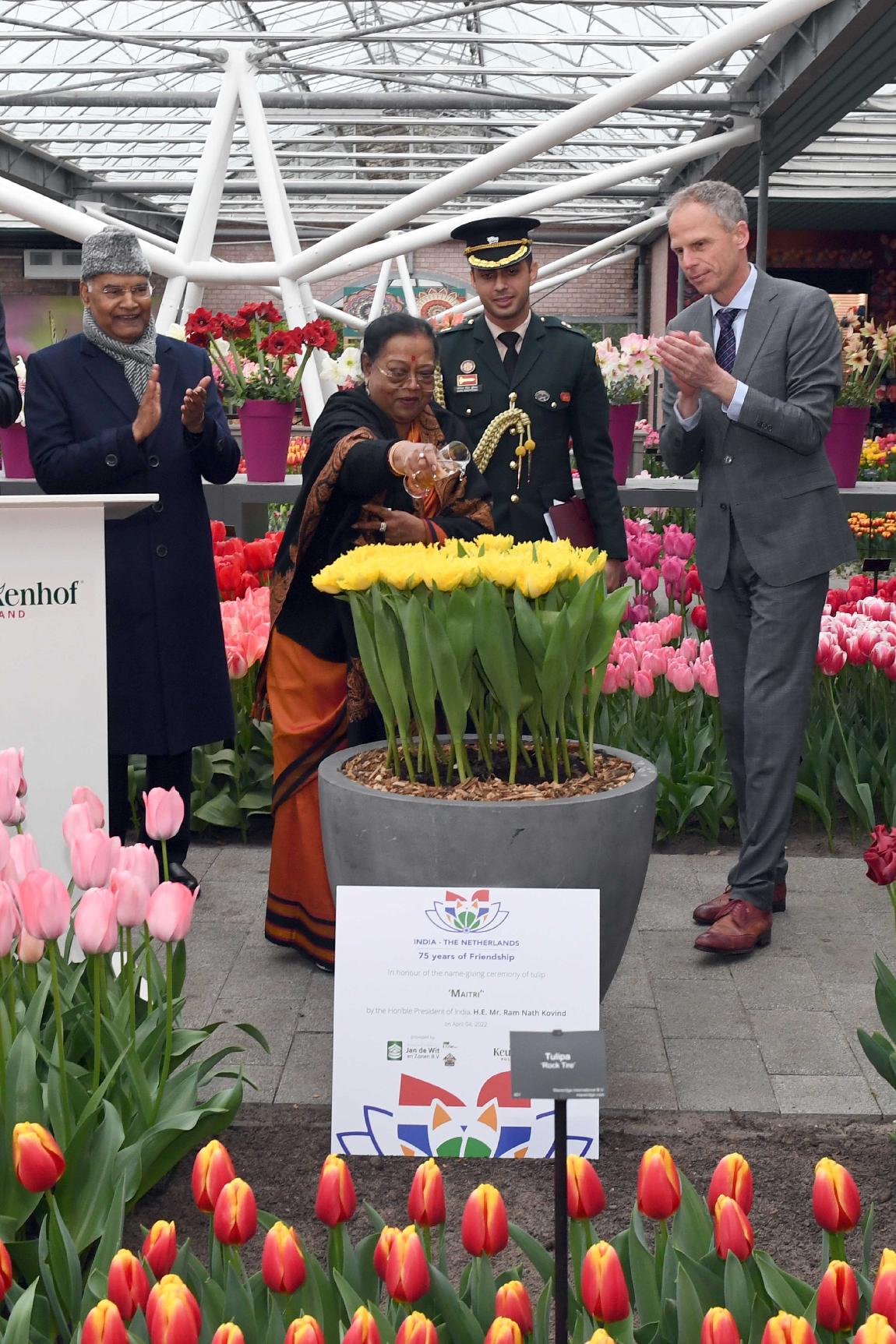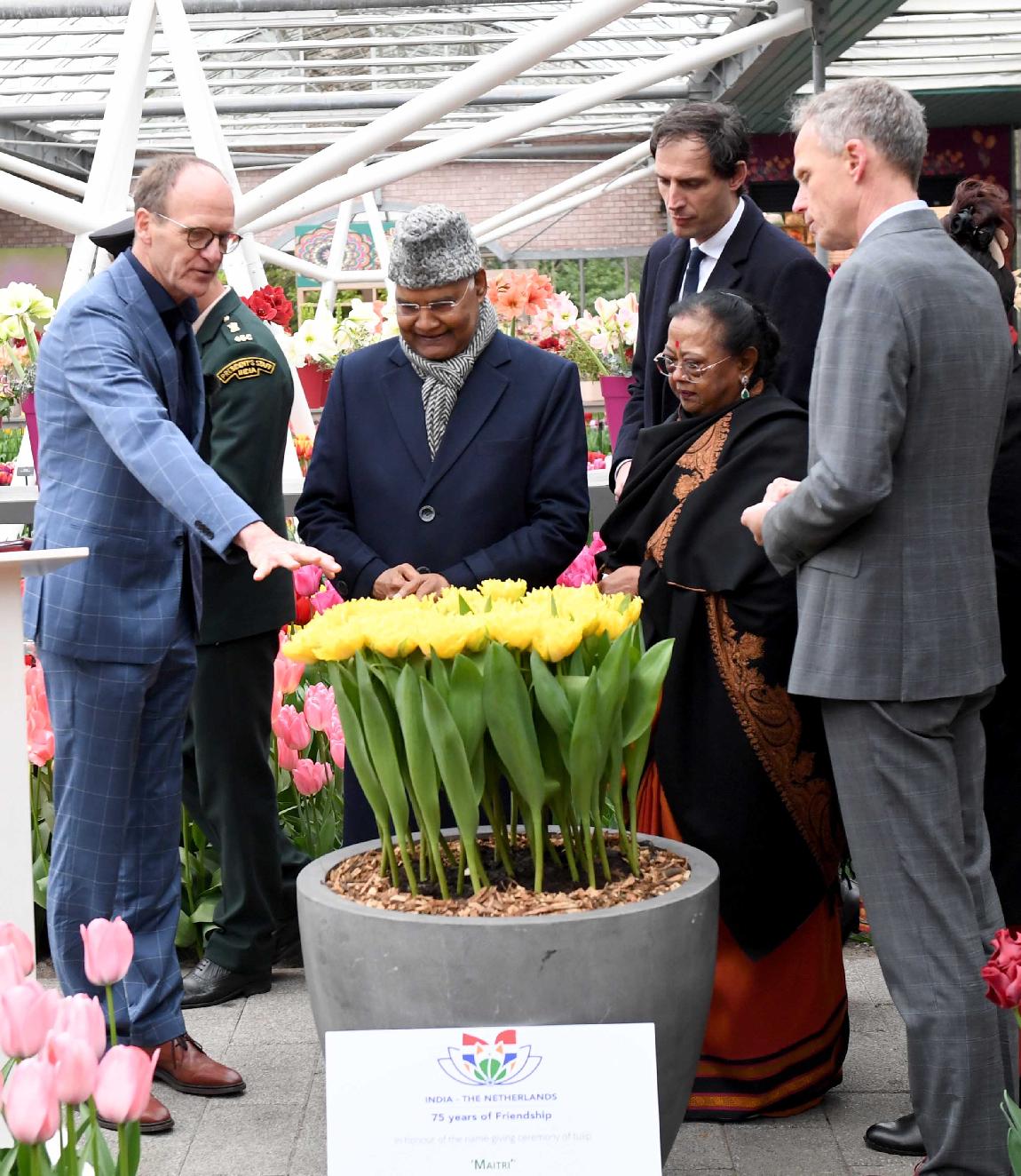 | Caption: | The President of India, Shri Ram Nath Kovind and the First Lady Smt. Savita Kovind visited Keukenhof, in Amsterdam, Netherlands on April 04, 2022.The President named a new breed of yellow tulips 'Maitri' symbolic of the special & enduring friendship between India and the Netherlands. |