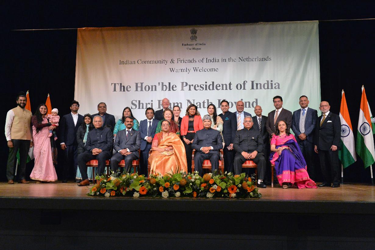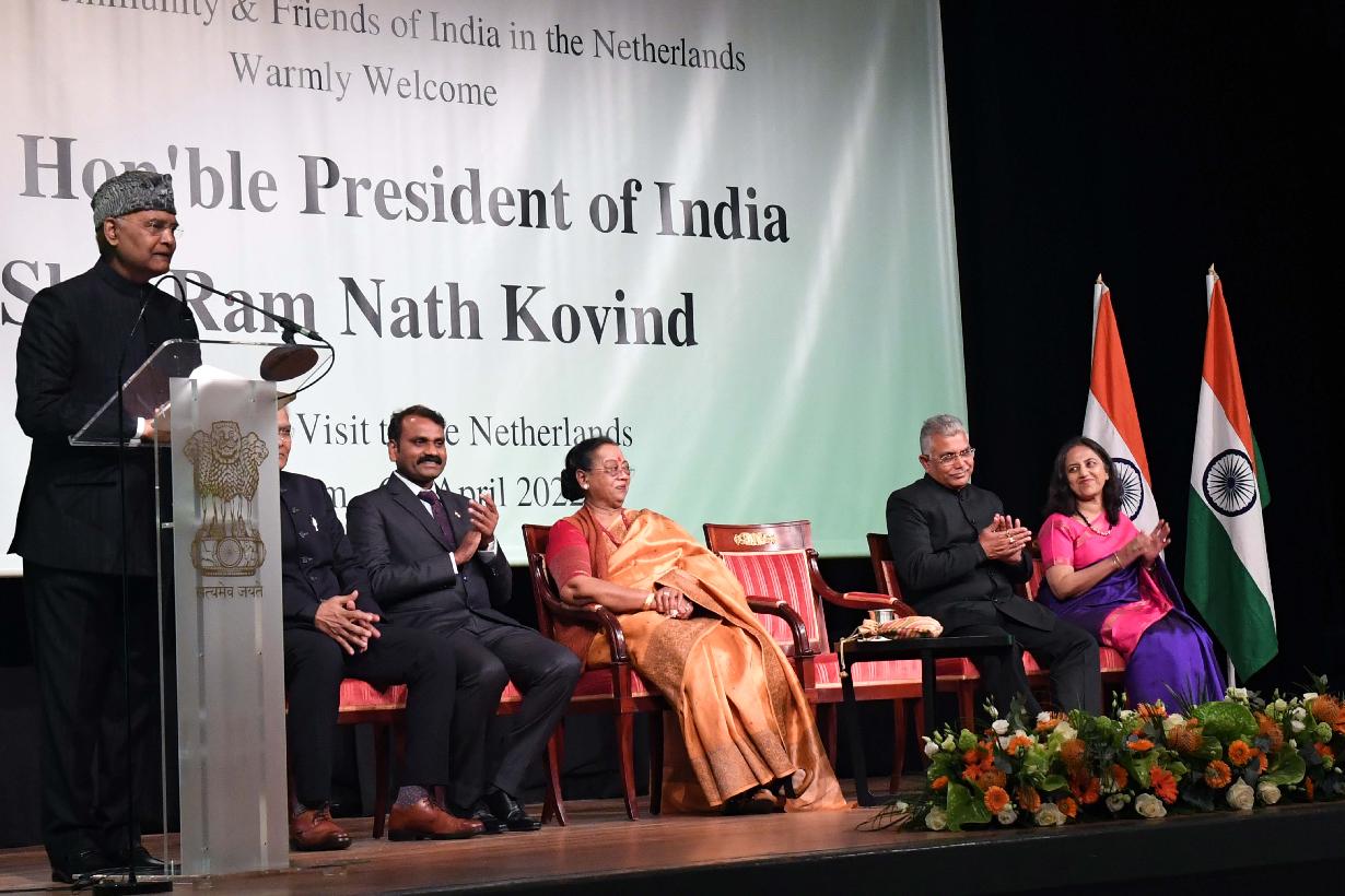 | Caption: | The President of India, Shri Ram Nath Kovind addresses the Indian Community and Friends of India at the Indian Community Reception, in Amsterdam on April 06, 2022. |