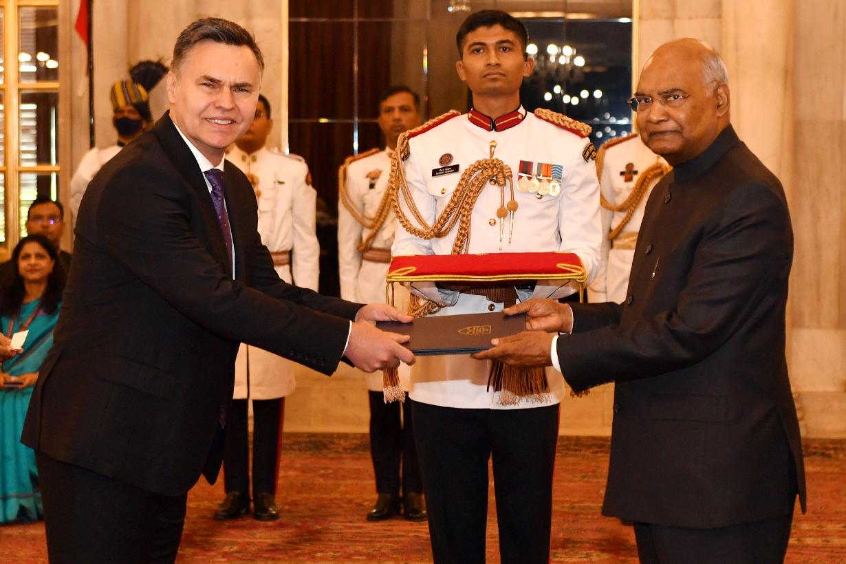 | Caption: | The Ambassador of the Slovak Republic, H.E. Mr. Robert Maxian presenting his credentials to the President of India, Shri Ram Nath Kovind, at Rashtrapati Bhavan on May 11, 2022. |