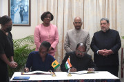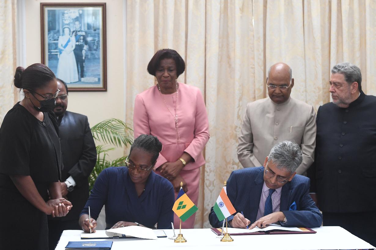 | Caption: | The President of India, Shri Ram Nath Kovind, the Governor General of Saint Vincent and the Grenadines, H.E. Ms. Dame Susan Dougan and the Prime Minister, Dr. the Hon. Ralph E. Gonsalves, witnessing the signing of MoUs on Exchange of Information and Assistance in Collection of Taxes and on Refurbishment of Old Carter Community Centre , in Kingstown, Saint Vincent and the Grenadines on May 19, 2022. |