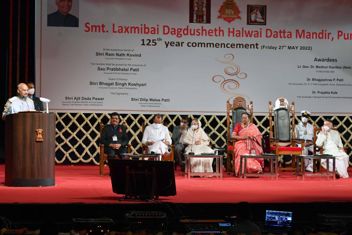 | Caption: | The President of India, Shri Ram Nath Kovind gracing the 125th year celebrations of Smt. Laxmibai Dagdusheth Halwai Datta Mandir Trust, in Pune, Maharashtra on May 27, 2022. |