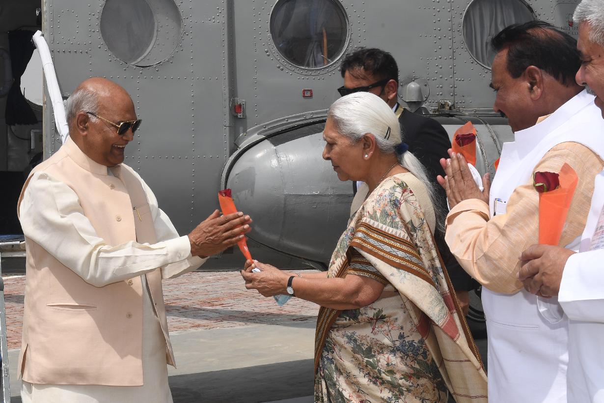 | Caption: | The President of India, Shri Ram Nath Kovind being received by the Governor of Uttar Pradesh, Smt. Anandiben Patel, on arrival in his native village Paraunkh, in Kanpur Dehat on June 03, 2022. |