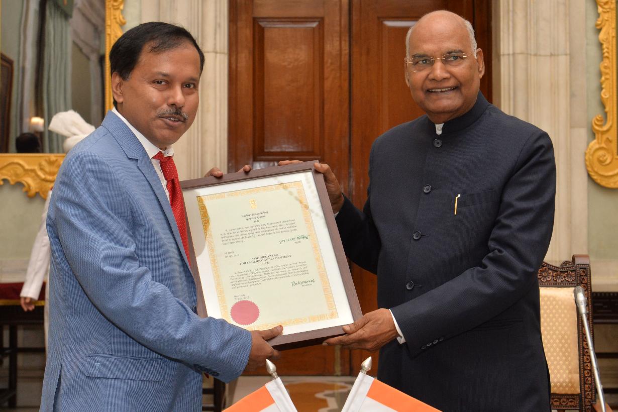| Caption: | The President of India, Shri Ram Nath Kovind presenting the Visitor s Award 2020 for Technology Development to Prof. Pritam Deb, Department of Physics, Tezpur University for his work on development of biodegradable polymer film reinforced with two-dimensional hetero-structure for food packaging, at Rashtrapati Bhavan on June 07, 2022. |