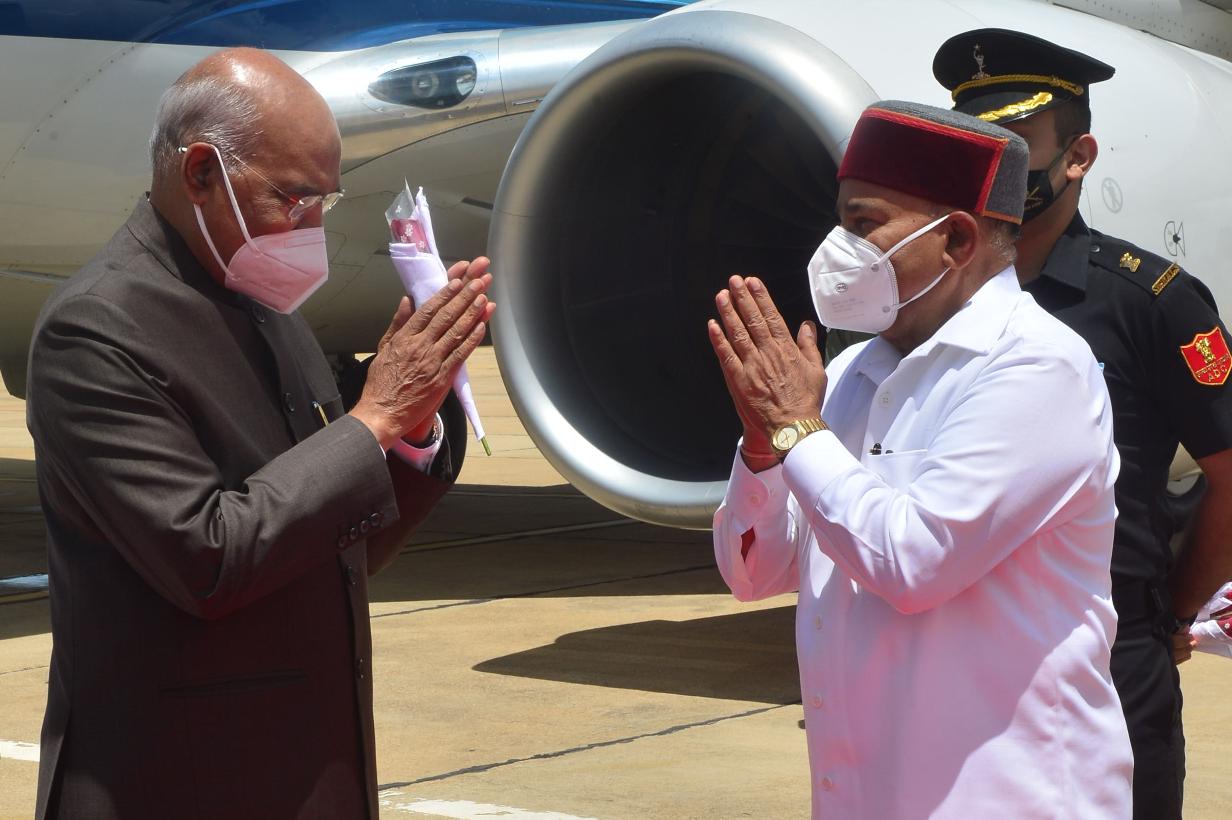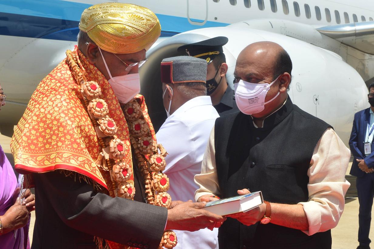 | Caption: | The President of India, Shri Ram Nath Kovind being received by the Governor of Karnataka, Shri Thaawarchand Gehlot and the Chief Minister, Shri Basavaraj Bommai, on his arrival in Bengaluru on June 13, 2022. |