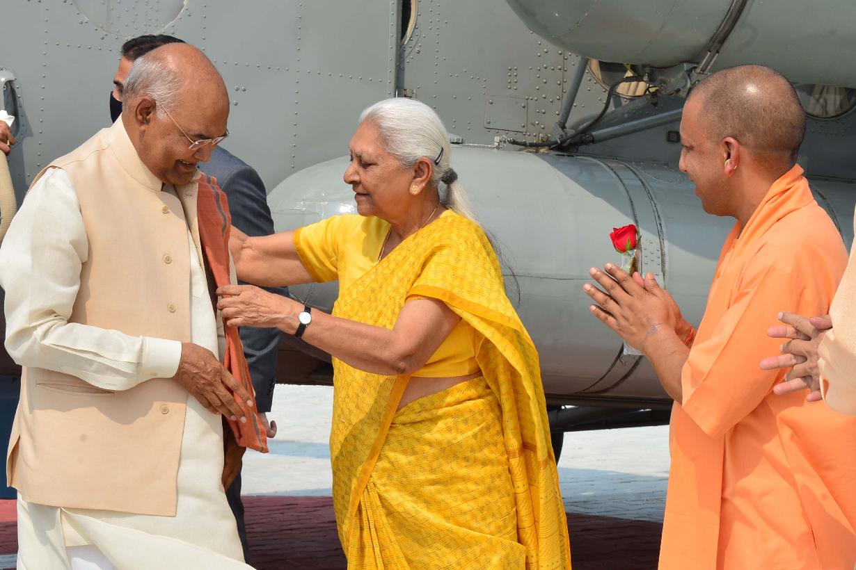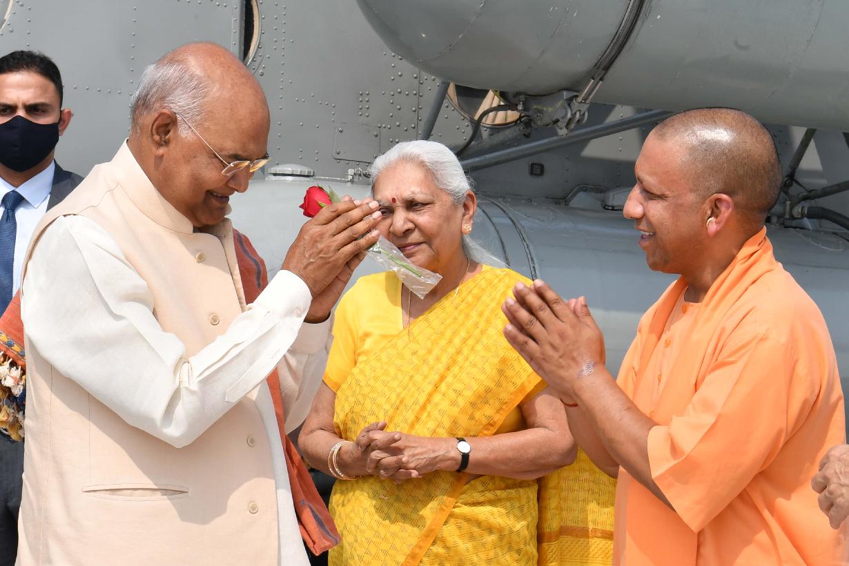 | Caption: | The President of India, Shri Ram Nath Kovind being received by the Governor of Uttar Pradesh, Smt. Anandiben Patel and the Chief Minister, Shri Yogi Adityanath, on his arrival, in Mathura on June 27, 2022. |