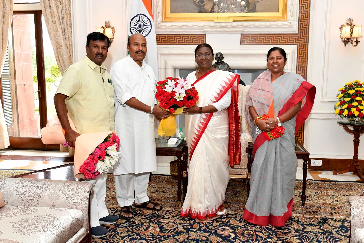 | Caption: | The Union Minister for Social Justice and Empowerment, Dr. Virendra Kumar along with the Ministers of State in the Ministry of Social Justice and Empowerment, Shri A. Narayanaswamy and Ms. Pratima Bhoumik calling on the President of India, Smt. Droupadi Murmu, at Rashtrapati Bhavan on August 01, 2022. |