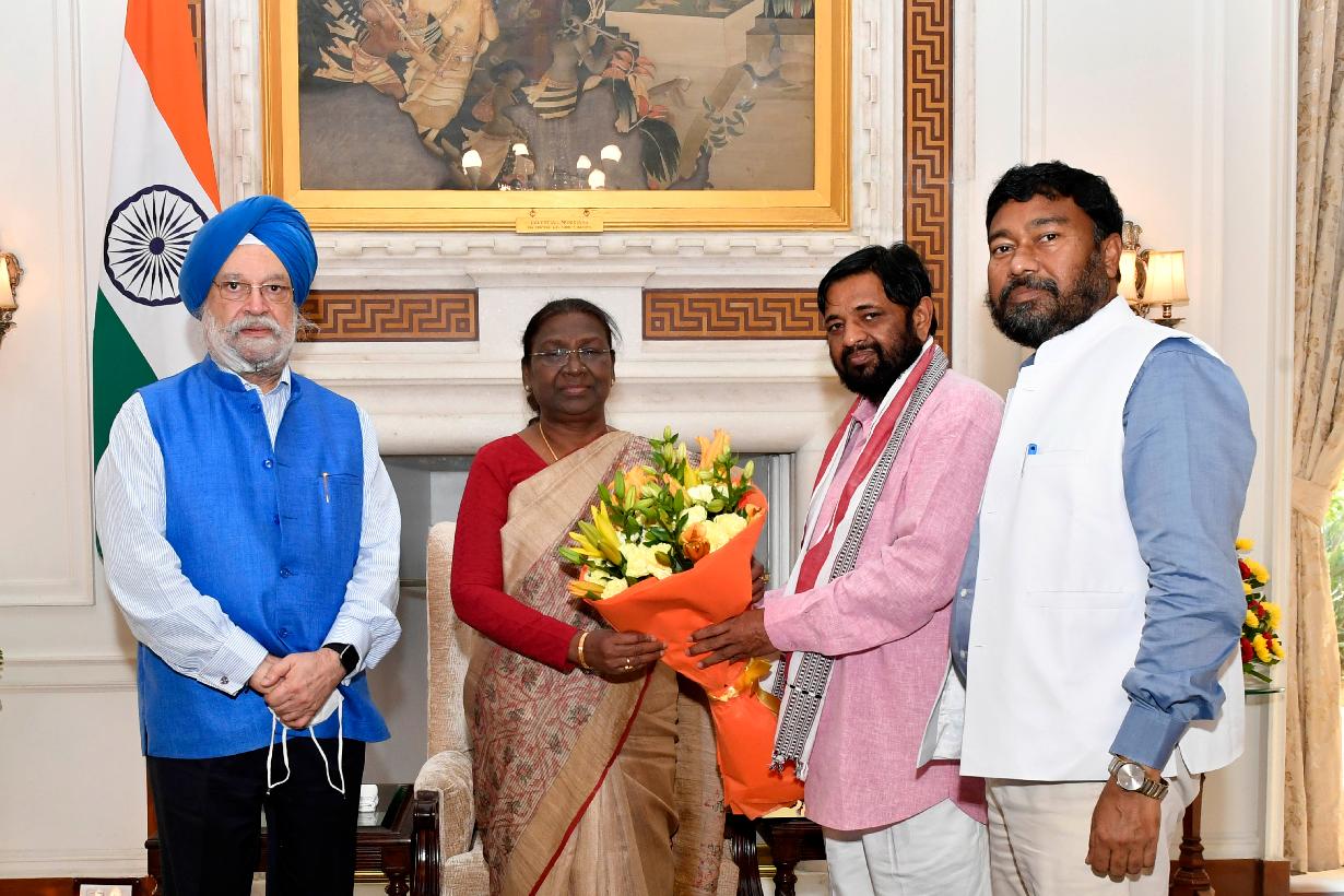 | Caption: | The Union Minister for Housing & Urban Affairs and Petroleum & Natural Gas, Shri Hardeep Singh Puri along with the Minister of State for Housing & Urban Affairs, Shri Kaushal Kishore and the Minister of State for Petroleum & Natural Gas, Shri Rameswar Teli calling on the President of India, Smt. Droupadi Murmu, at Rashtrapati Bhavan on August 01, 2022. |