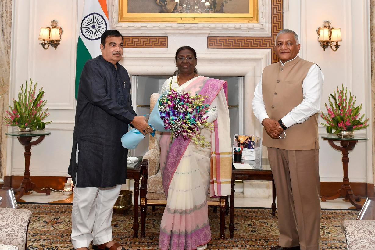 | Caption: | The Union Minister for Road Transport and Highways, Shri Nitin Gadkari along with the Minister of State for Road Transport and Highways, Dr. V.K. Singh calling on the President of India, Smt. Droupadi Murmu, at Rashtrapati Bhavan on August 02, 2022. |