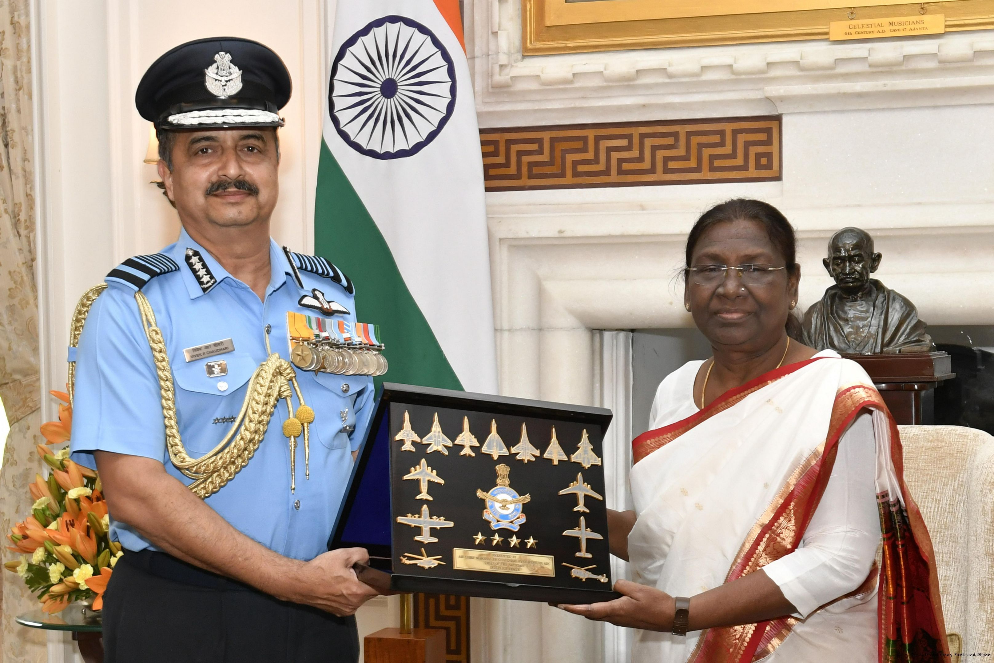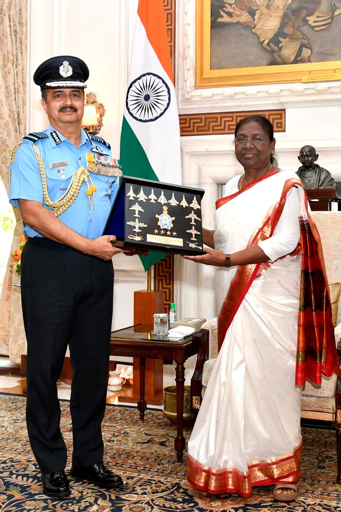 | Caption: | The Chief of the Air Staff, Air Chief Marshal V.R. Chaudhari calling on the President of India, Smt. Droupadi Murmu, at Rashtrapati Bhavan on August 03, 2022. |