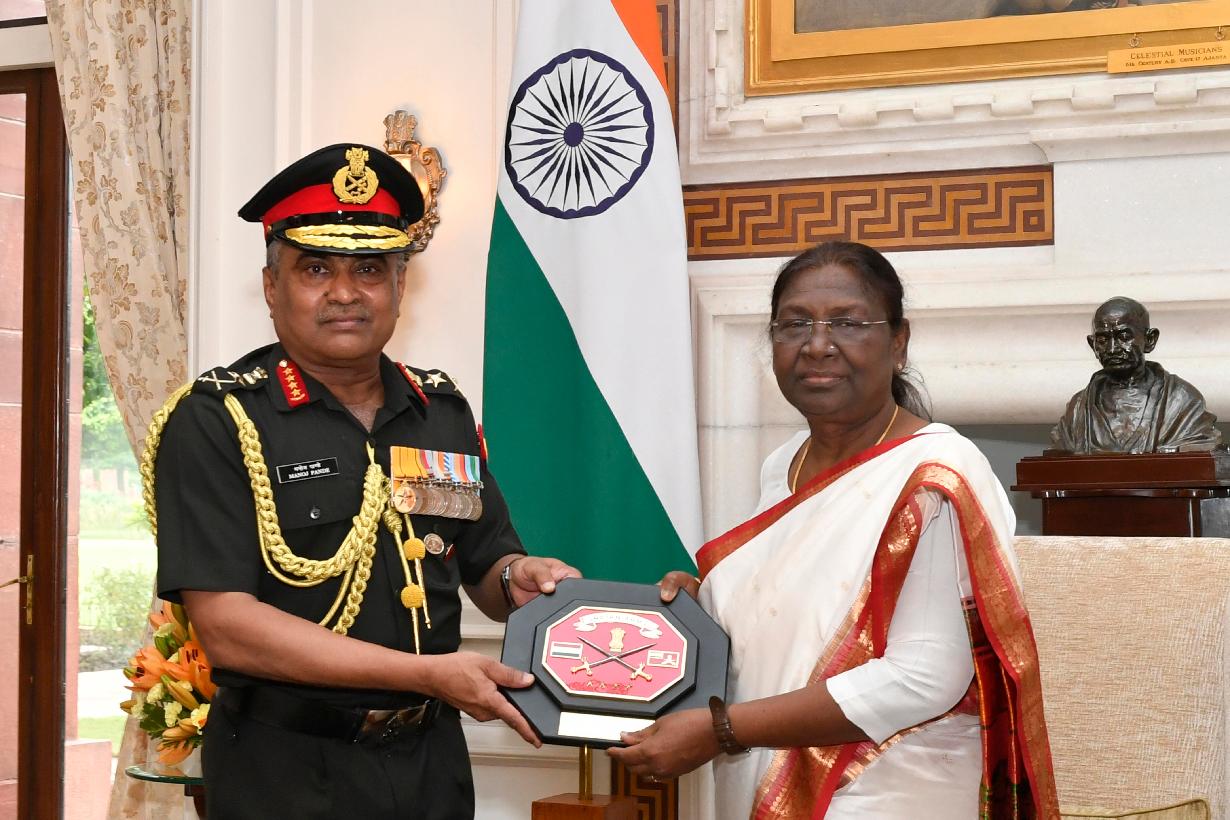 | Caption: | The Chief of the Army Staff, General Manoj Pande calling on the President of India, Smt. Droupadi Murmu, at Rashtrapati Bhavan on August 03, 2022. |