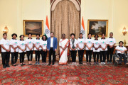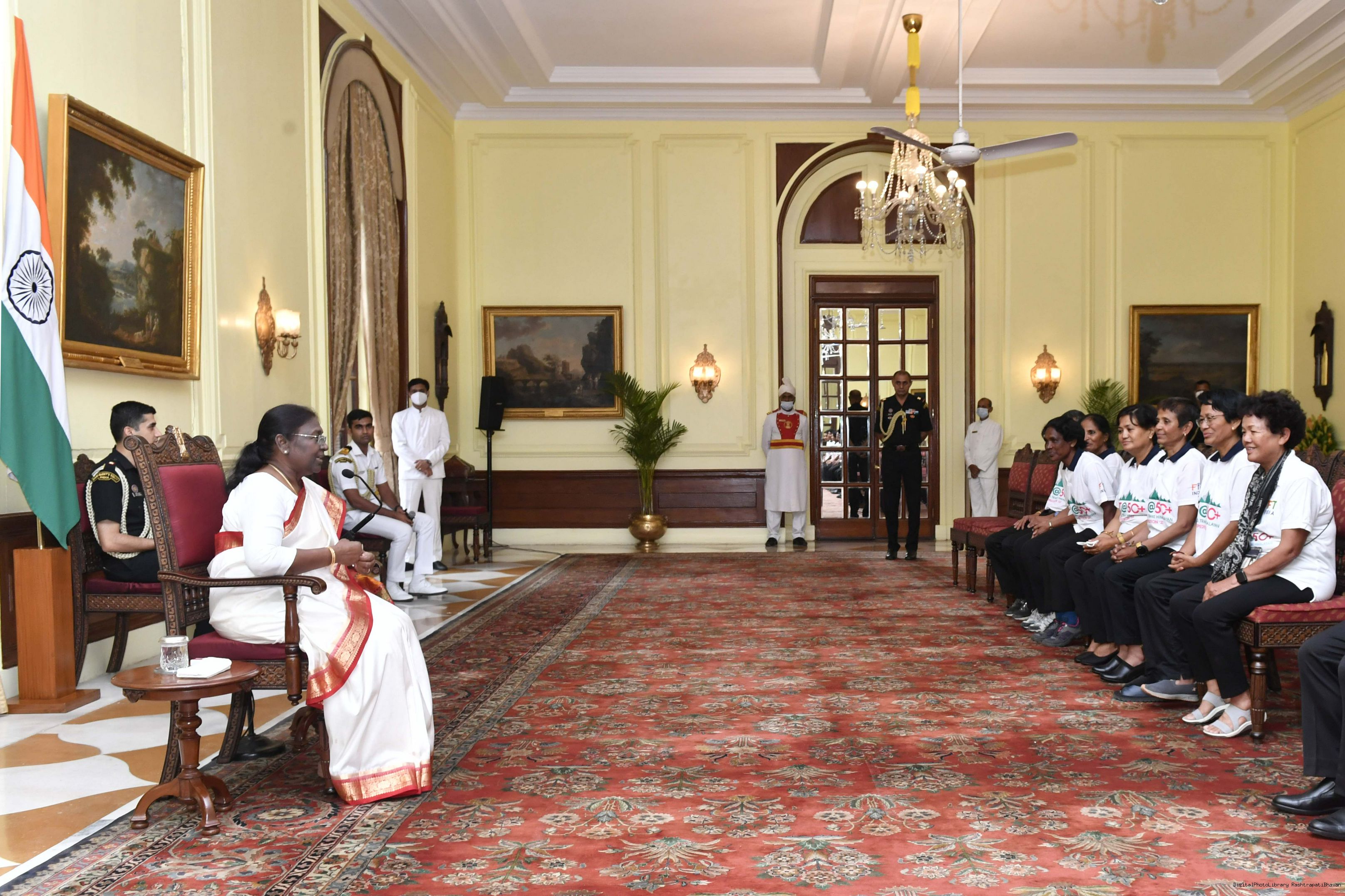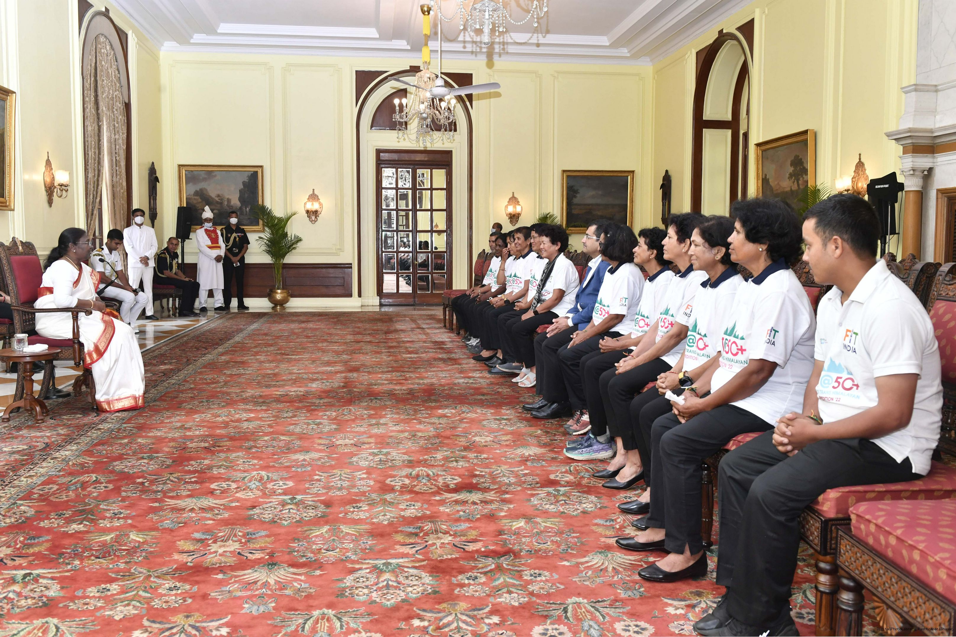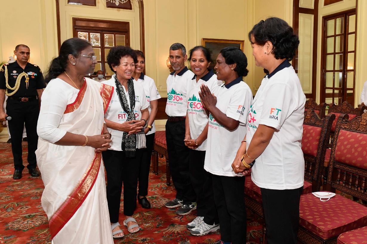 | Caption: | Ms. Bachendri Pal along with the members of Fit@50+ Women's Trans Himalayan Expedition 2022 calling on the President of India, Smt. Droupadi Murmu, at Rashtrapati Bhavan on August 03, 2022. |