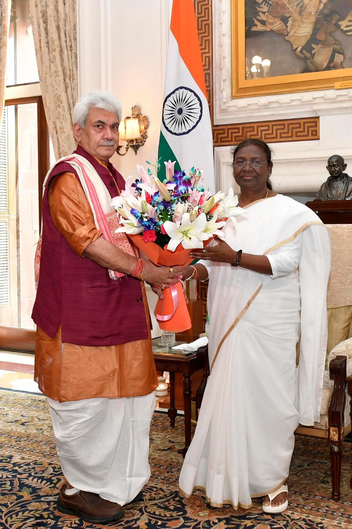 | Caption: | The Lt. Governor of Jammu Kashmir, Shri Manoj Sinha calling on the President of India, Smt. Droupadi Murmu, at Rashtrapati Bhavan on August 08, 2022. |