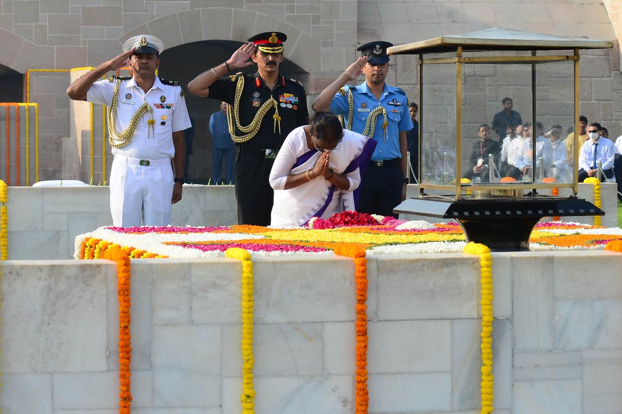 | Caption: | The President of India, Smt. Droupadi Murmu paying homage to Mahatma Gandhi, on his birth anniversary, at Rajghat, in New Delhi on October 02, 2022. |
