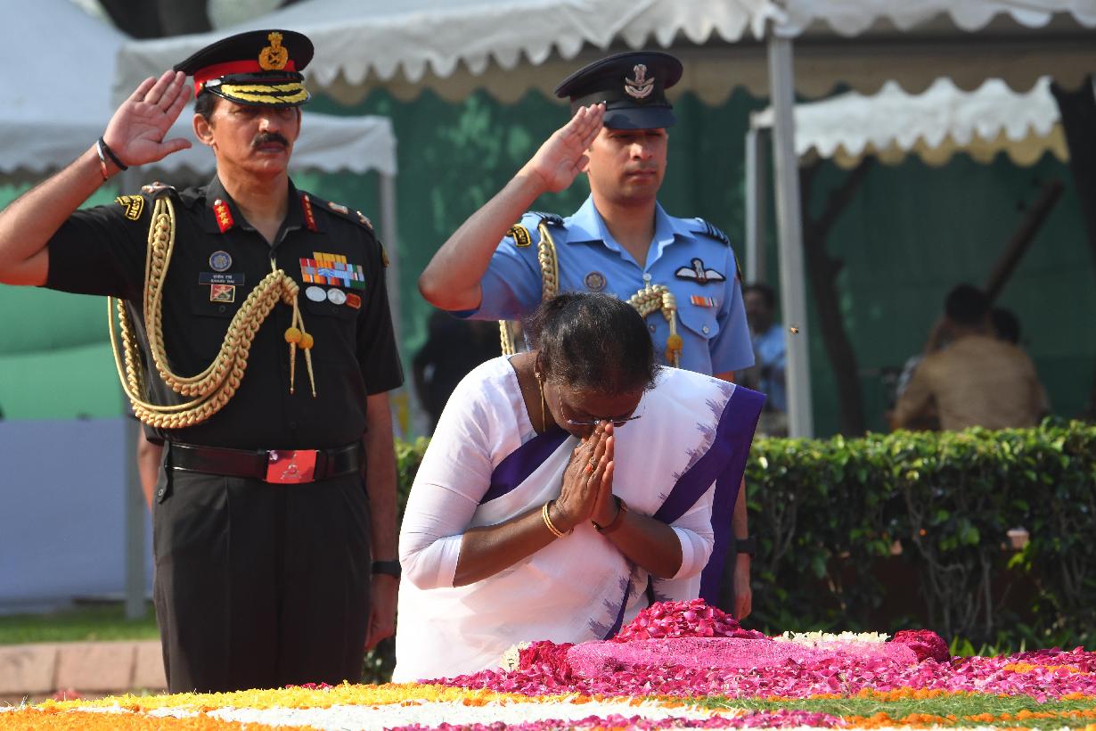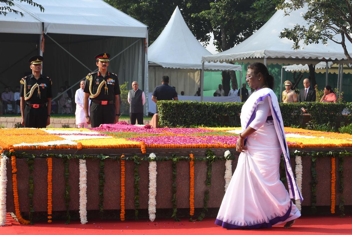 | Caption: | The President of India, Smt. Droupadi Murmu paid tributes to Shri Lal Bahadur Shastri, former Prime Minister of India, on his birth anniversary, at Vijay Ghat, in New Delhi on October 02, 2022. |