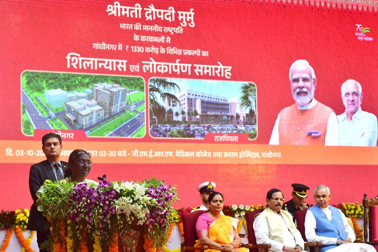 | Caption: | The President of India, Smt. Droupadi Murmu laid the foundation stones for various Union and State government projects related to health, irrigation, water supply and upgradation of Deendayal Port, Kandla from GMERS, Gandhinagar on October 03, 2022. |