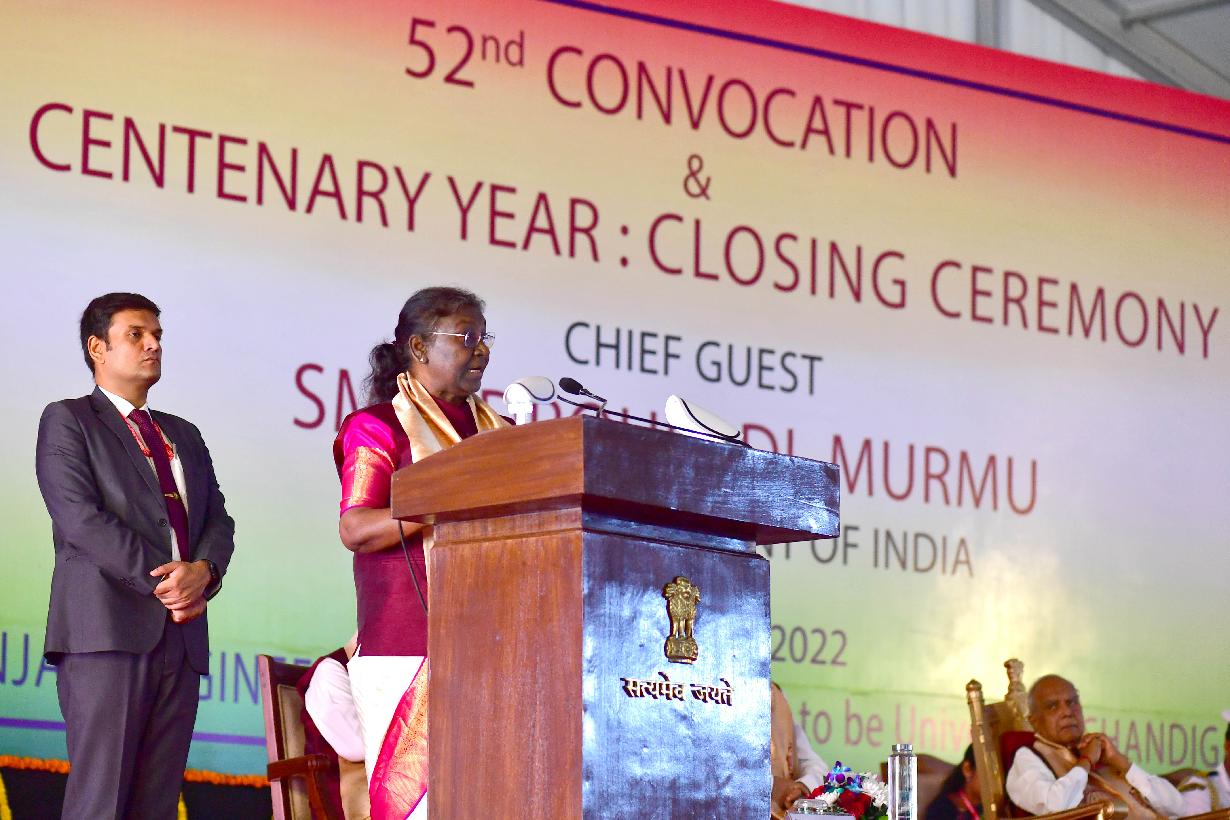 | Caption: | The President of India, Smt. Droupadi Murmu gracing the 52nd convocation and closing ceremony of centenary year celebrations of Punjab Engineering College, in Chandigarh on October 09, 2022. |