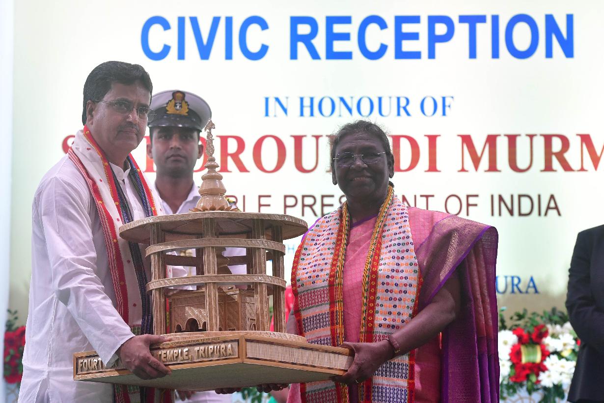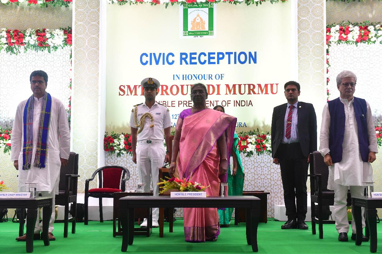 | Caption: | The President of India, Smt. Droupadi Murmu attended a civic reception hosted by the Government of Tripura in her honour, at Town Hall, in Agartala on October 12, 2022. |