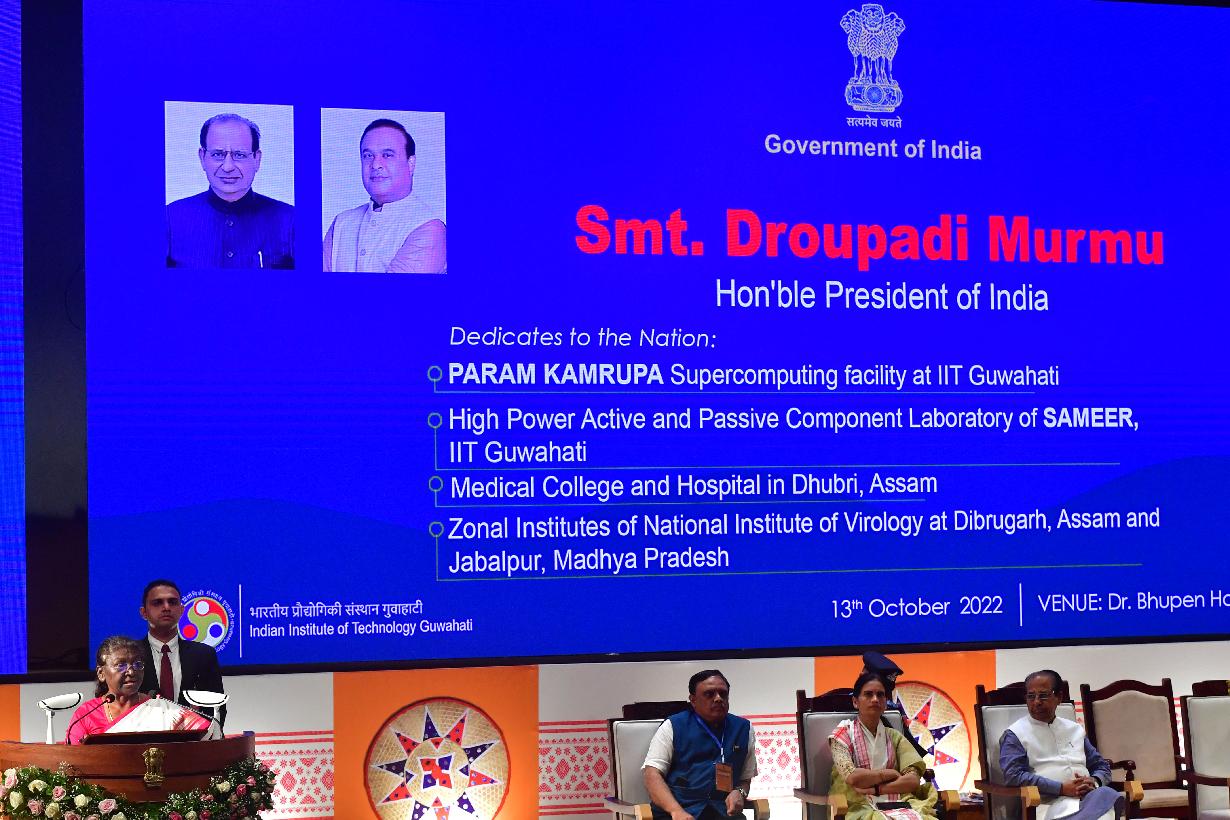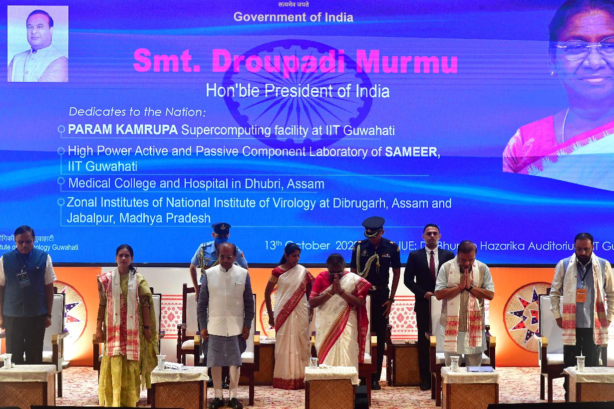| Caption: | The President of India, Smt. Droupadi Murmu inaugurated Supercomputing facility Param Kamrupa and laboratory for the design and development of high power microwave components, at IIT Guwahati on October 13, 2022. The President also inaugurated a Medical College and Hospital at Dhubri and laid the foundation stones for two Zonal Institutes of National Institute of Virology at Dibrugarh, Assam and Jabalpur, Madhya Pradesh on the occasion. |