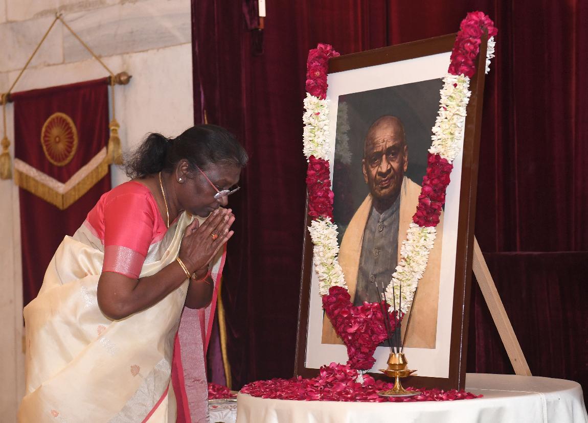 | Caption: | The President of India, Smt. Droupadi Murmu paying homage to Sardar Vallabhbhai Patel on his birth anniversary, at Rashtrapati Bhavan on October 31, 2022. |