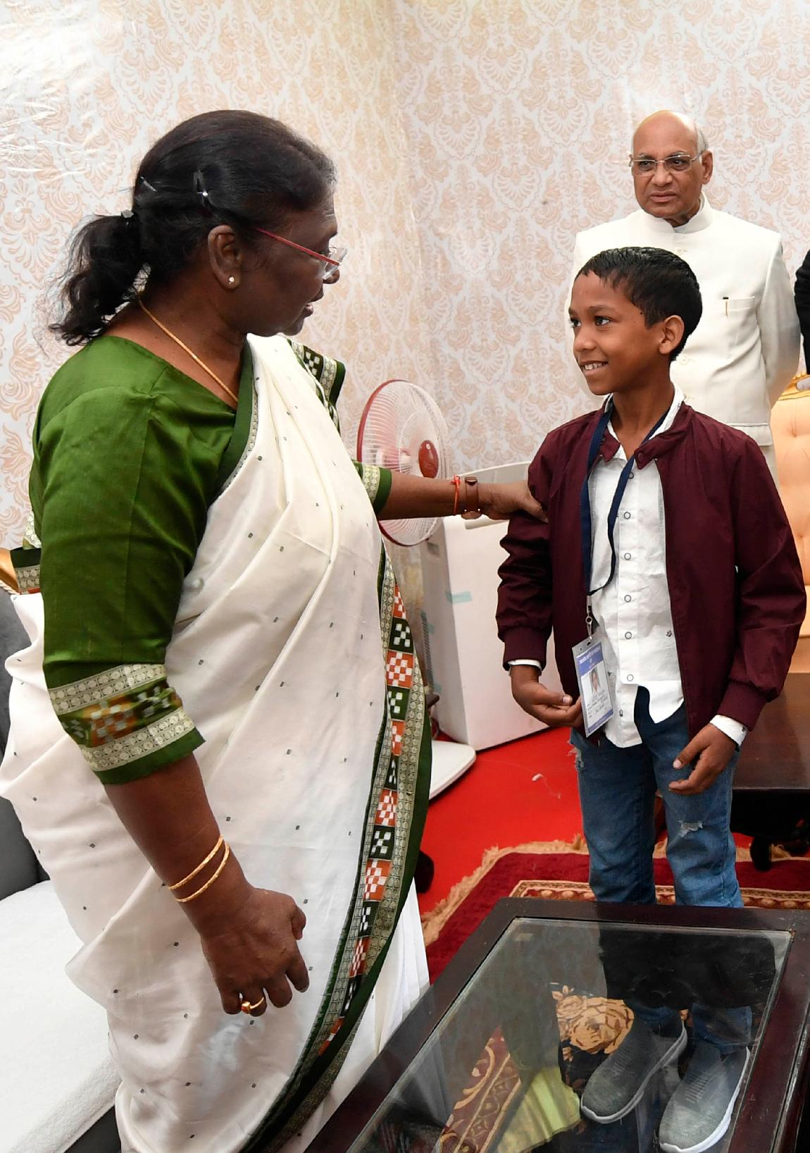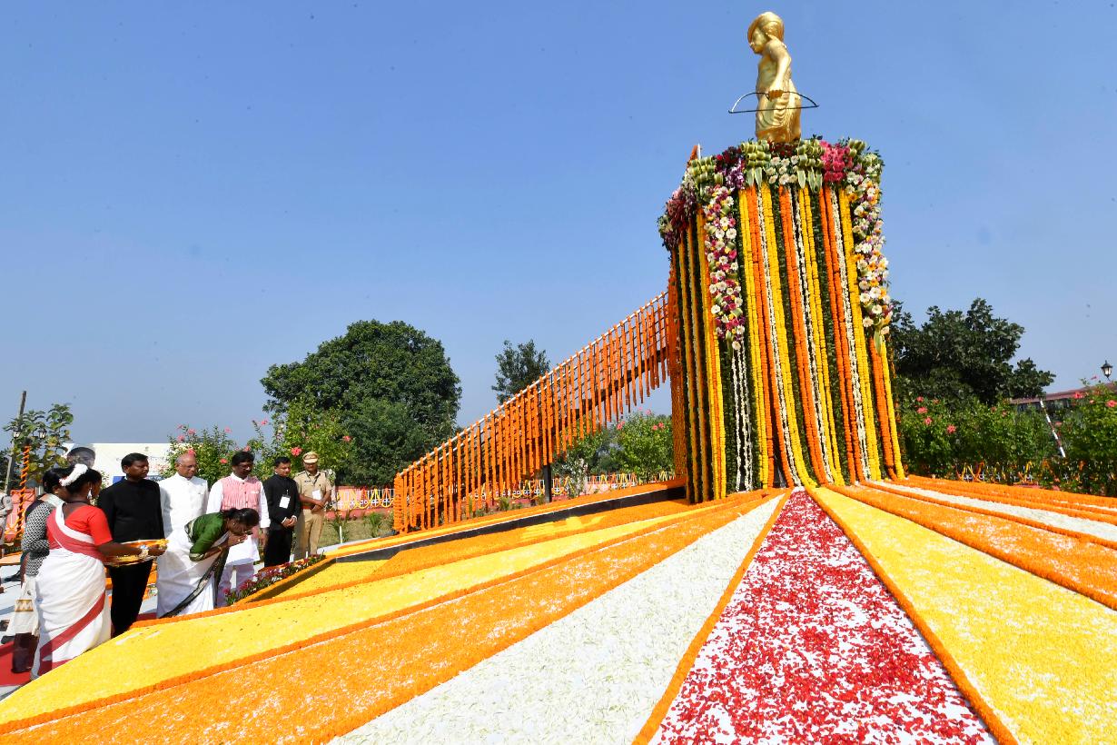 | Caption: | The President of India, Smt. Droupadi Murmu paid floral tributes to Bhagwan Birsa Munda and interacted with family members of Bhagwan Birsa, at Ulihatu Village, Khunti district, in Jharkhand on November 15, 2022. The President also met Lugni Munda, a divyaang lady and her son Dilip Munda whom President had adopted and funded his education. |