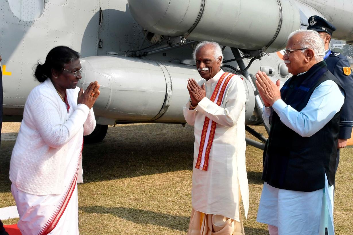 | Caption: | The Governor of Haryana, Shri Bandaru Dattatraya and the Chief Minister, Shri Manohar Lal received the President of India, Smt. Droupadi Murmu on her arrival, at Kurukshetra, in Haryana on November 29, 2022. |