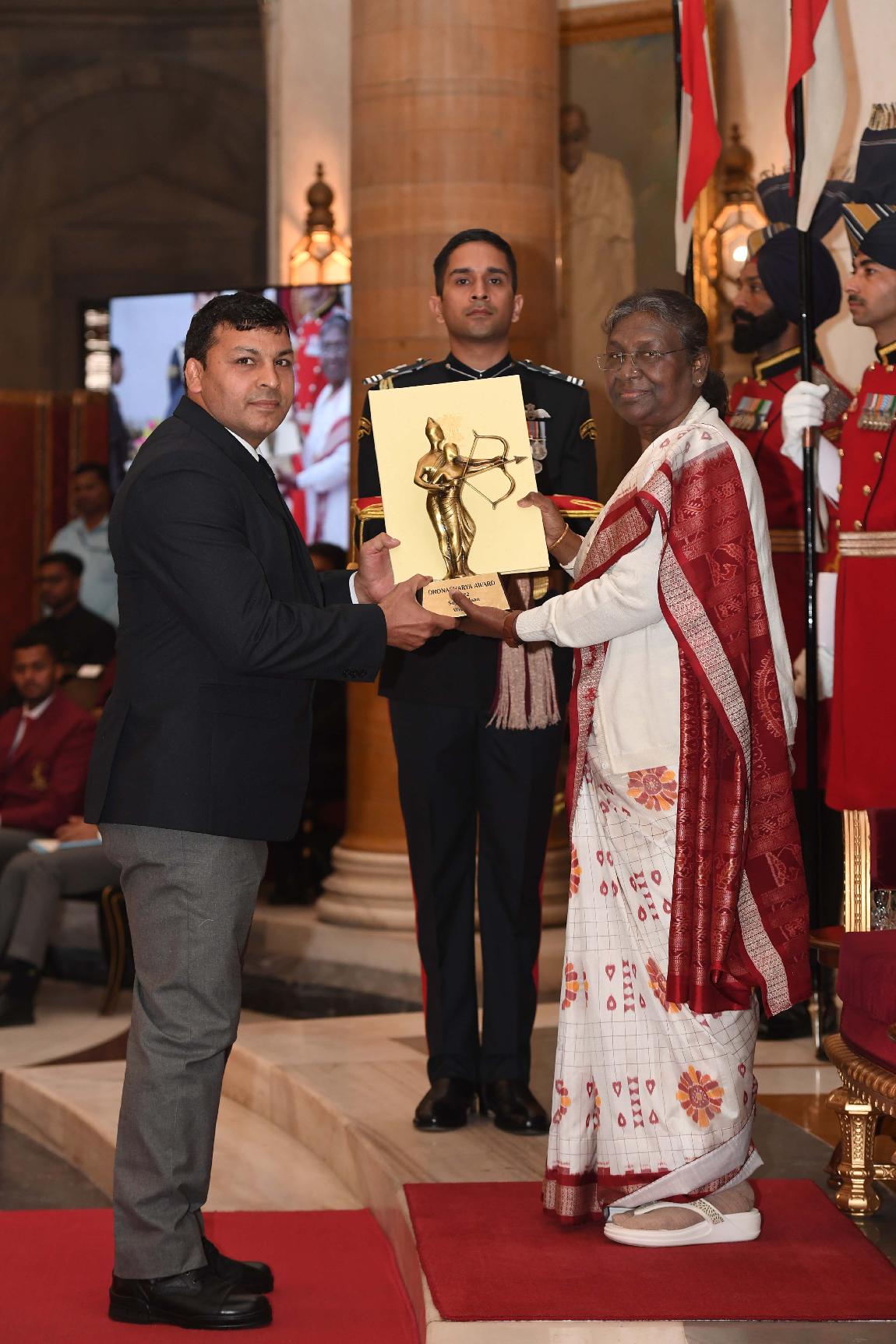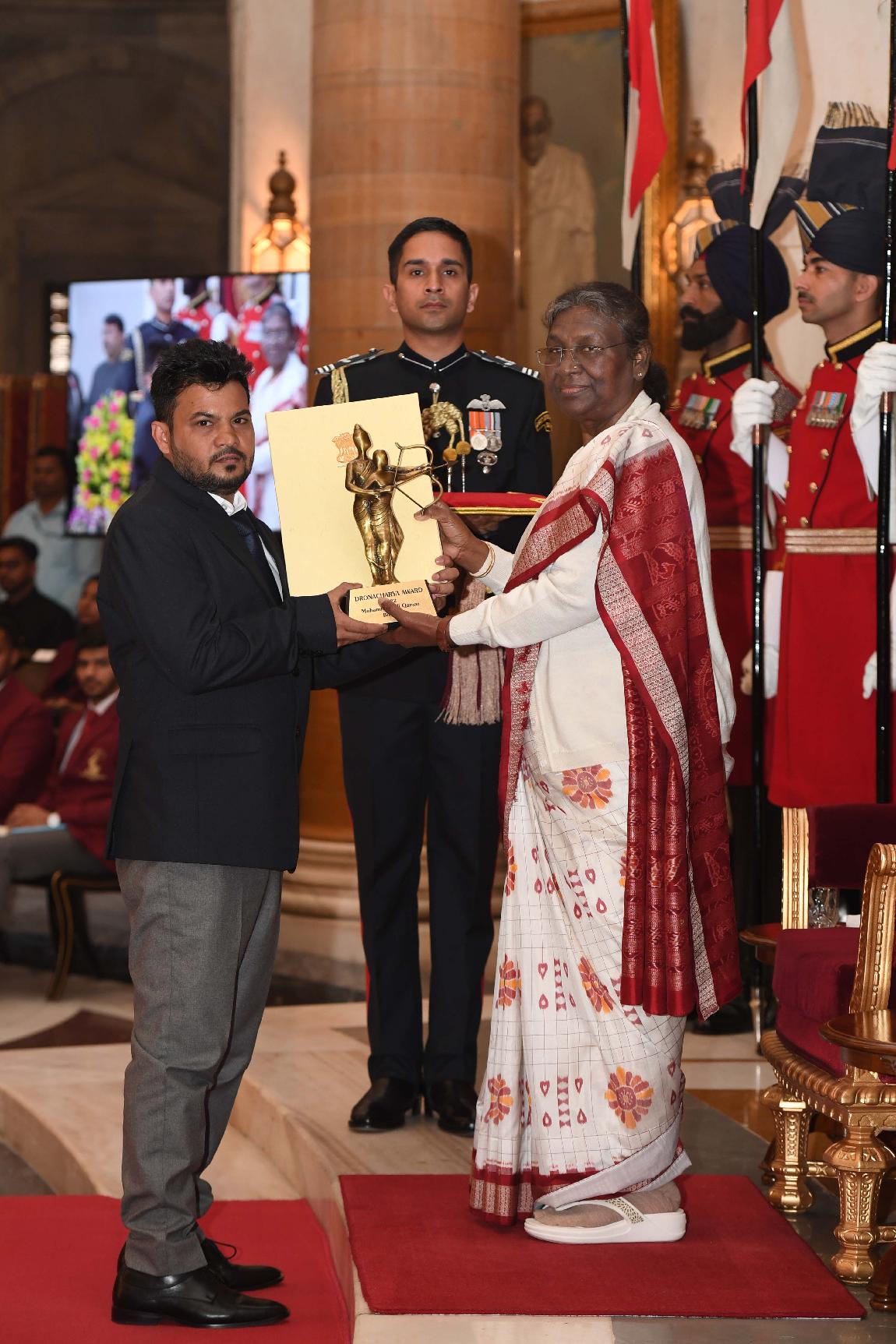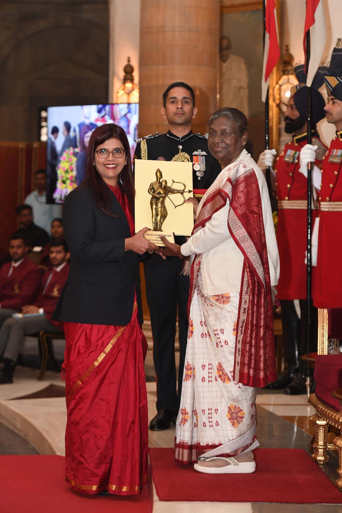 | Caption: | The President of India, Smt. Droupadi Murmu presenting Dronacharya Awards, 2022, at the Sports & Adventure Awards function, at Rashtrapati Bhavan on November 30, 2022. |