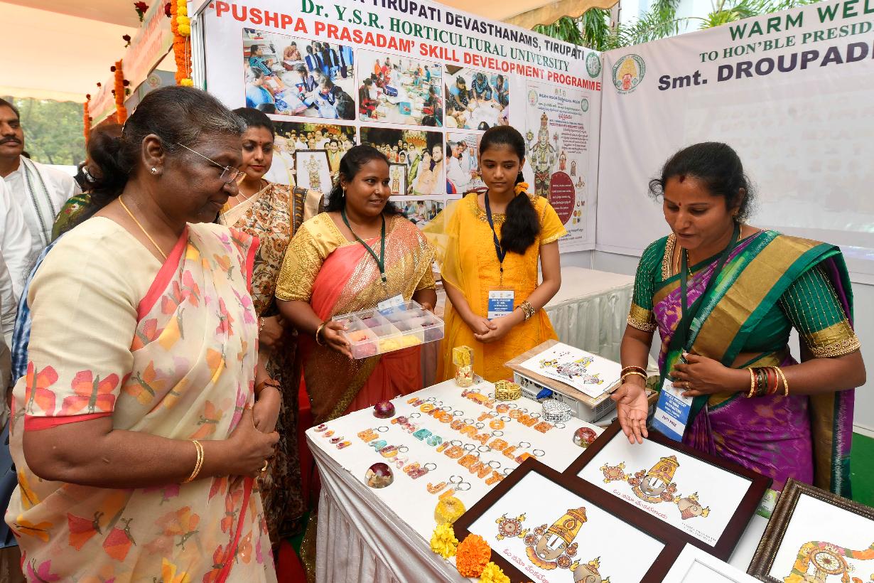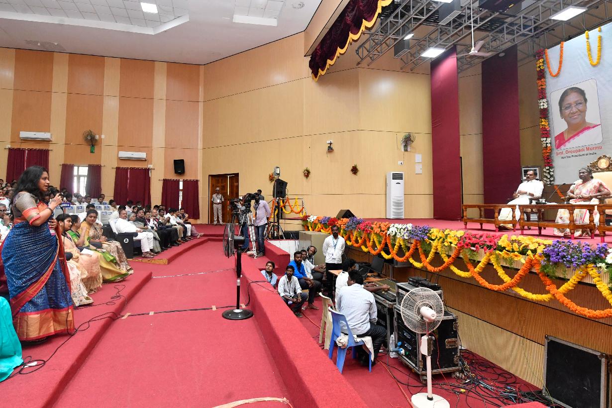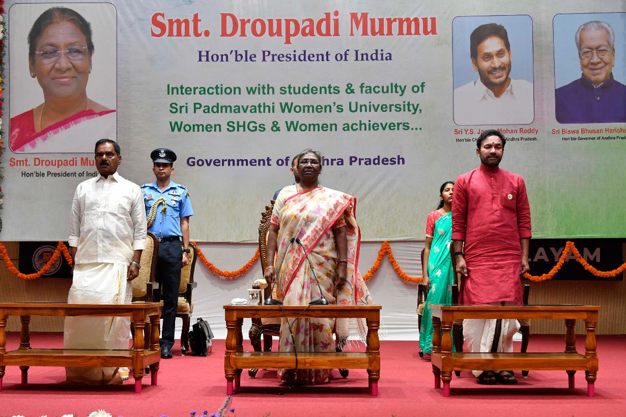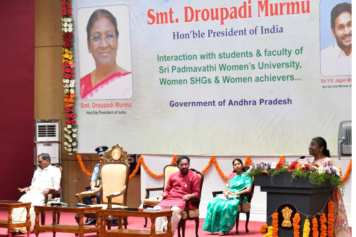 | Caption: | The President of India, Smt. Droupadi Murmu interacted with students and faculty members, women SHGs and women achievers, at Padmavati Women s University, in Tirupati on December 05, 2022. |
