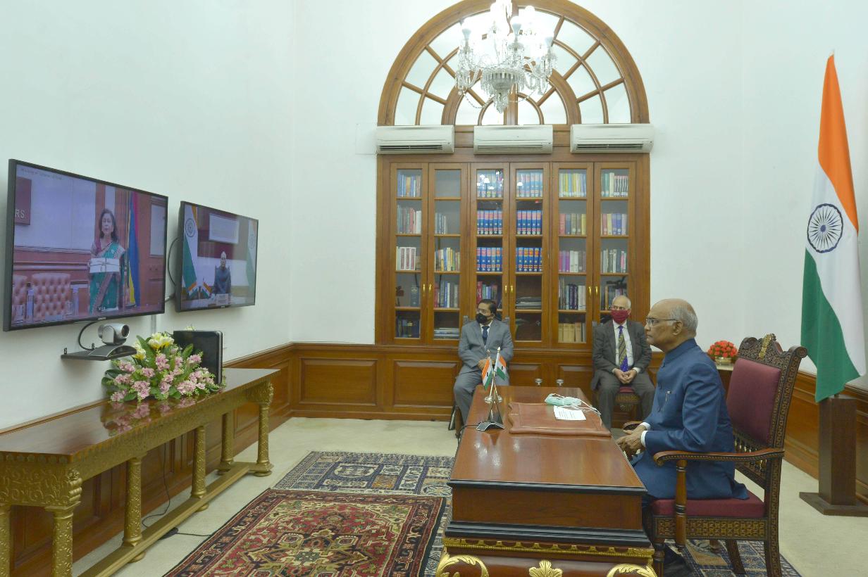 | Caption: | The High Commissioner-designate of the Republic of Mauritius, H.E. Mrs. Santi Bai Hanoomanjee presenting her credentials to the President of India, Shri Ram Nath Kovind through video conferencing, at Rashtrapati Bhavan on May 21, 2020. |