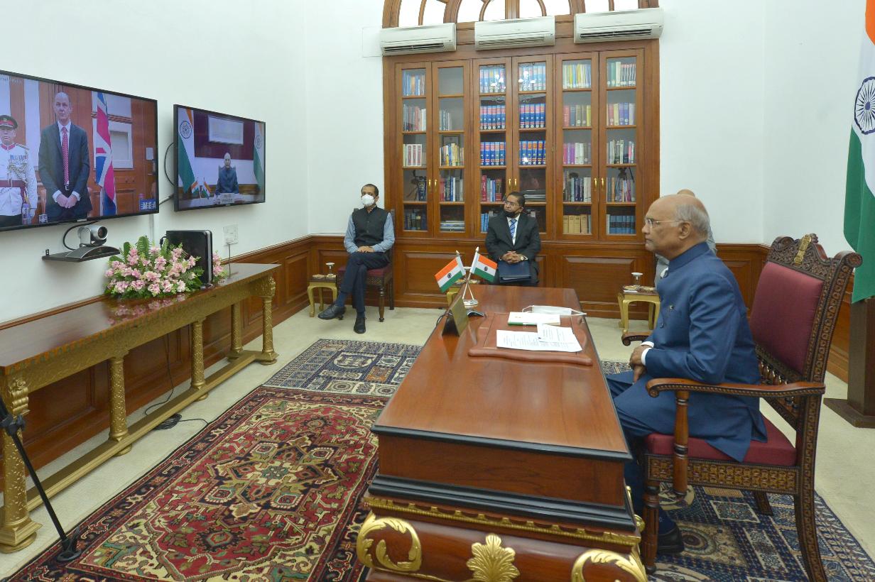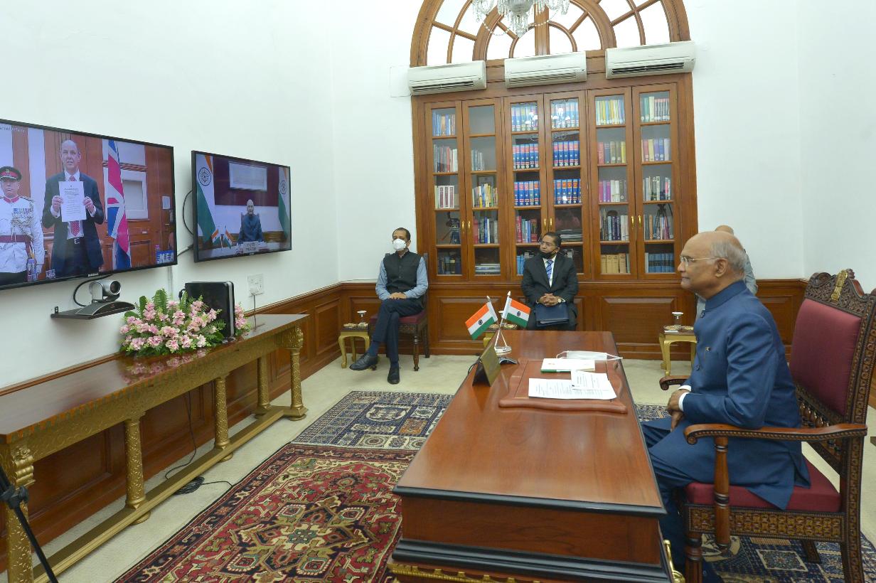 | Caption: | The High Commissioner-designate of the United Kingdom, H.E. Mr. Philip Barton presenting his credentials to the President of India, Shri Ram Nath Kovind through video conferencing, at Rashtrapati Bhavan on July 08, 2020. |
