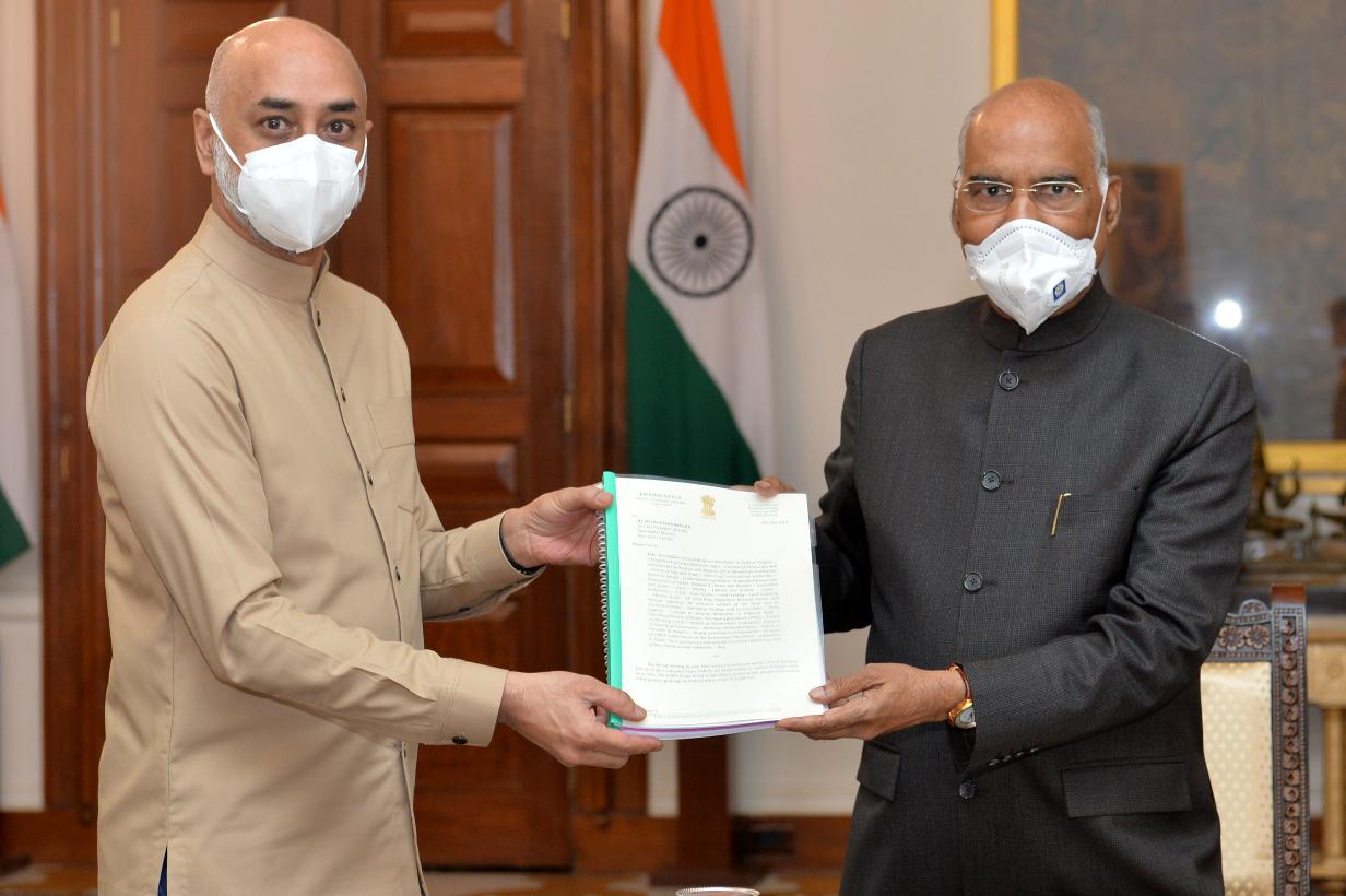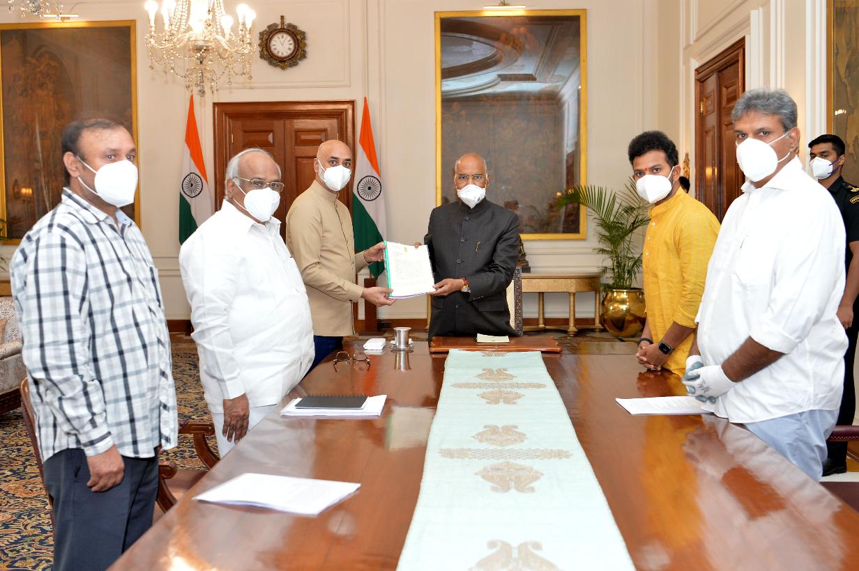 | Caption: | Shri Jayadev Galla, MP(LS) along with Shri Ram Mohan Naidu Kinjarapu, MP (LS), Shri Kesineni Srinivas, MP (LS) and Shri K. Ravindra Kumar, MP (RS) from Telugu Desam Party meeting with the President of India, Shri Ram Nath Kovind, at Rashtrapati Bhavan on July 16, 2020. |