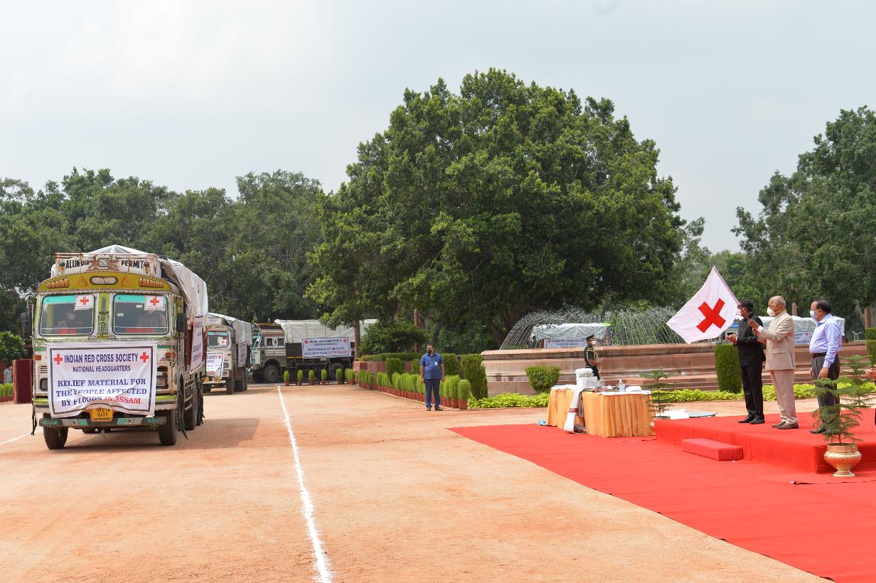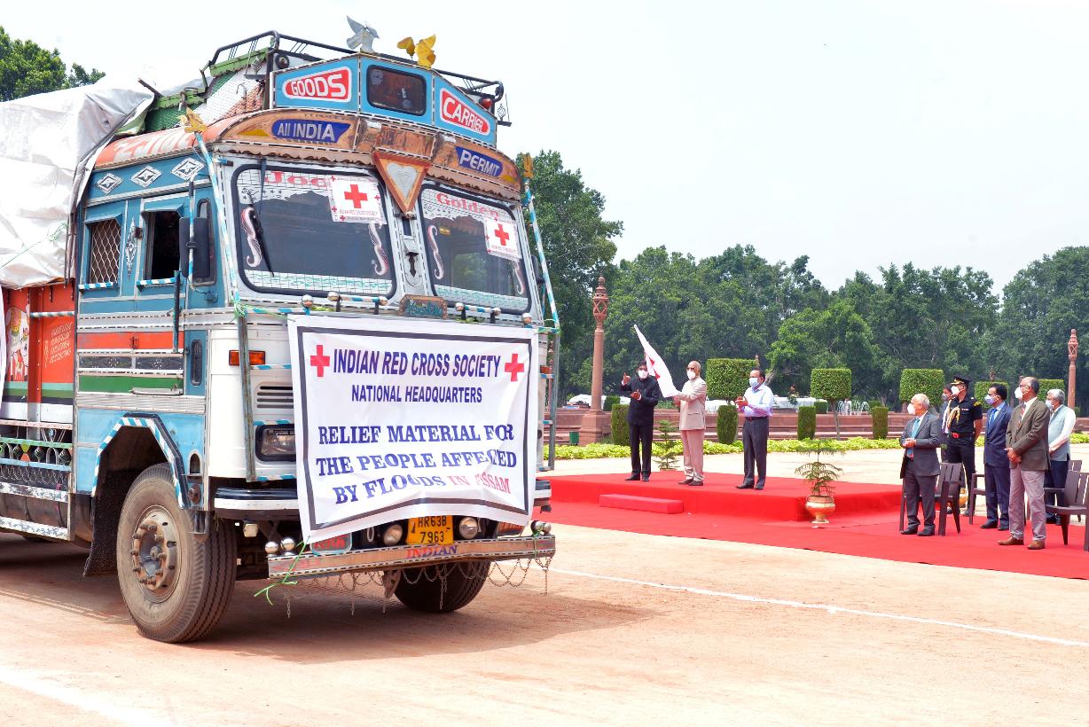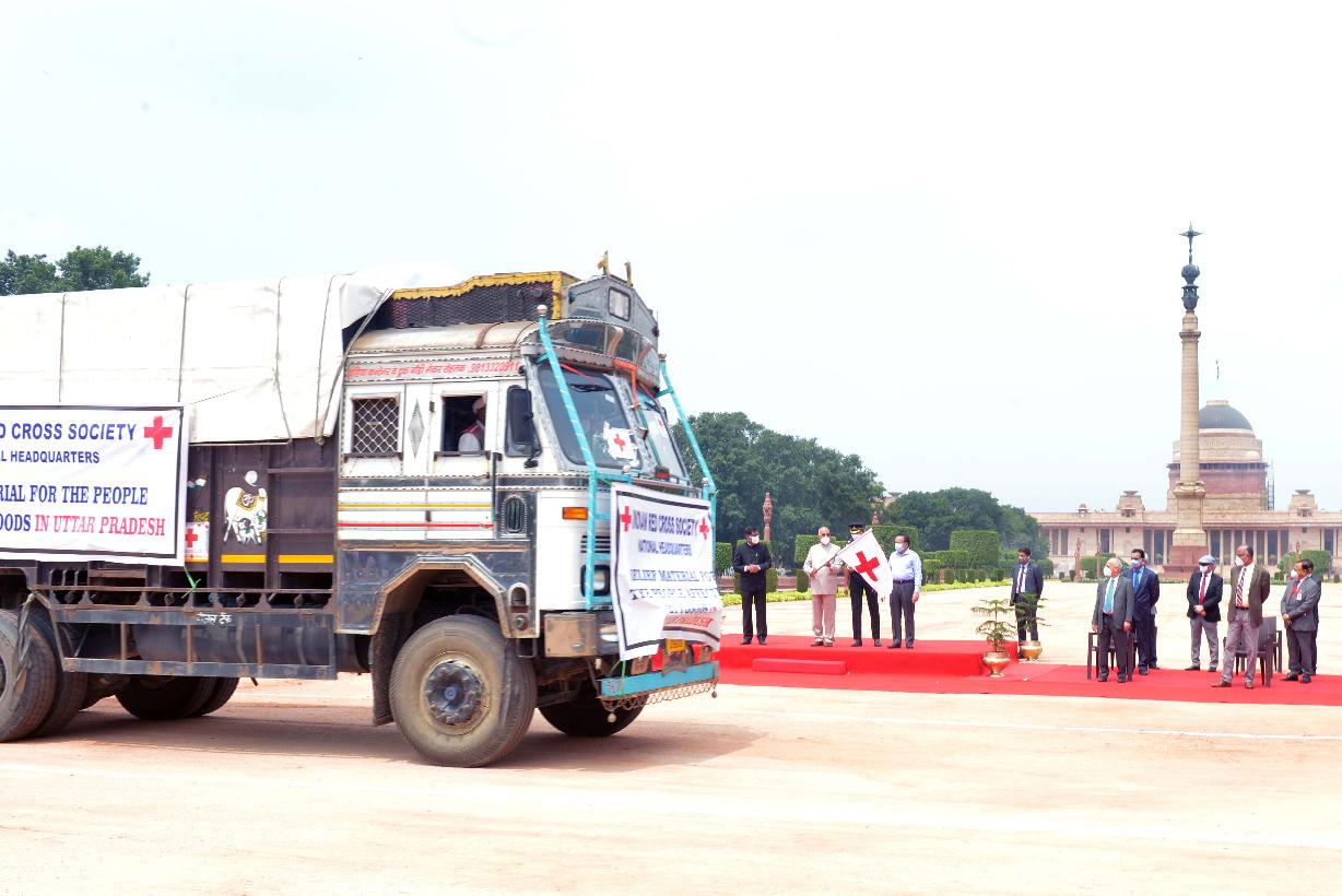 | Caption: | The President of India, Shri Ram Nath Kovind flagging off trucks of Red Cross relief supplies from Rashtrapati Bhavan for the people of Assam, Bihar, Uttar Pradesh affected by recent floods and COVID-19 pandemic, on July 24, 2020. |