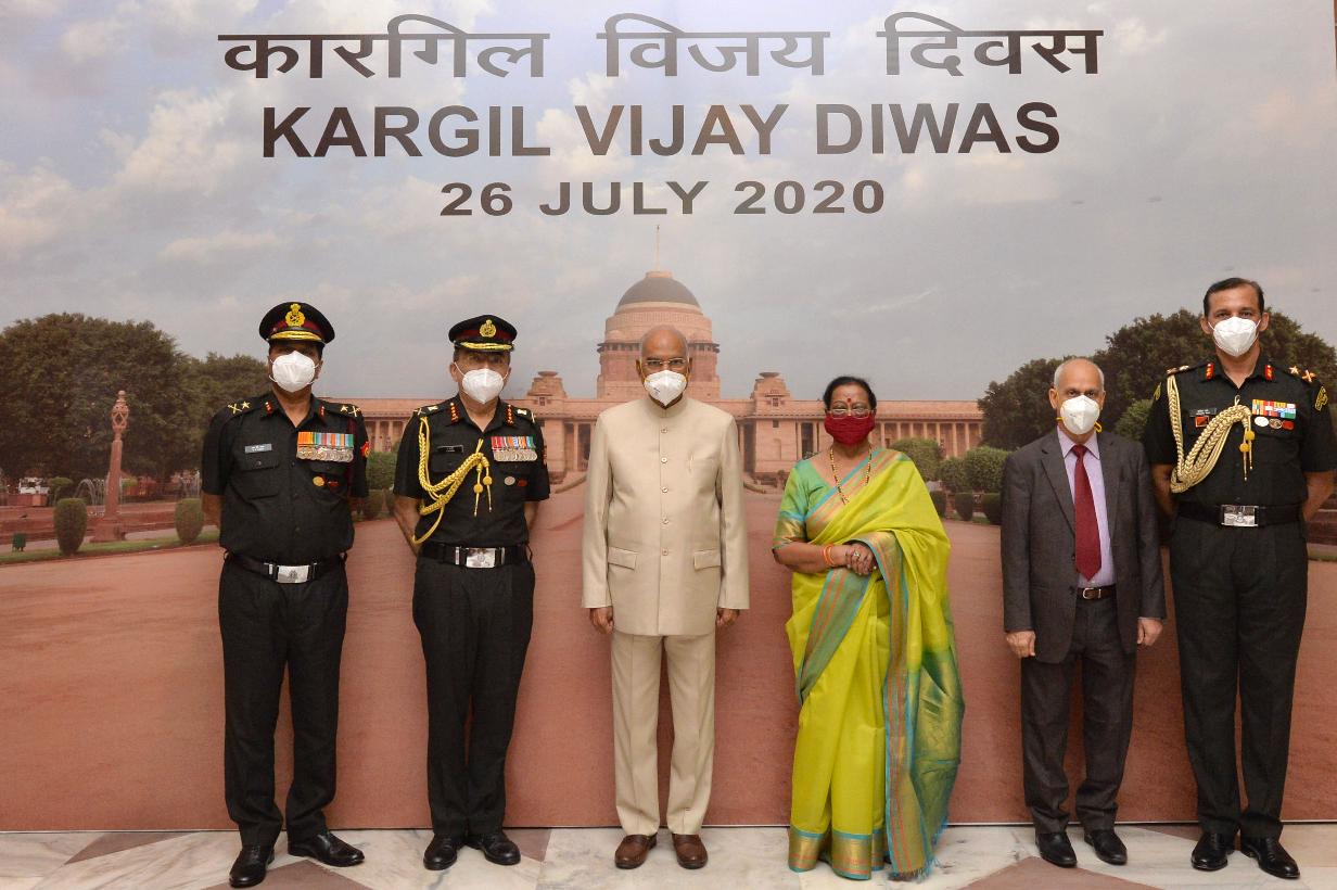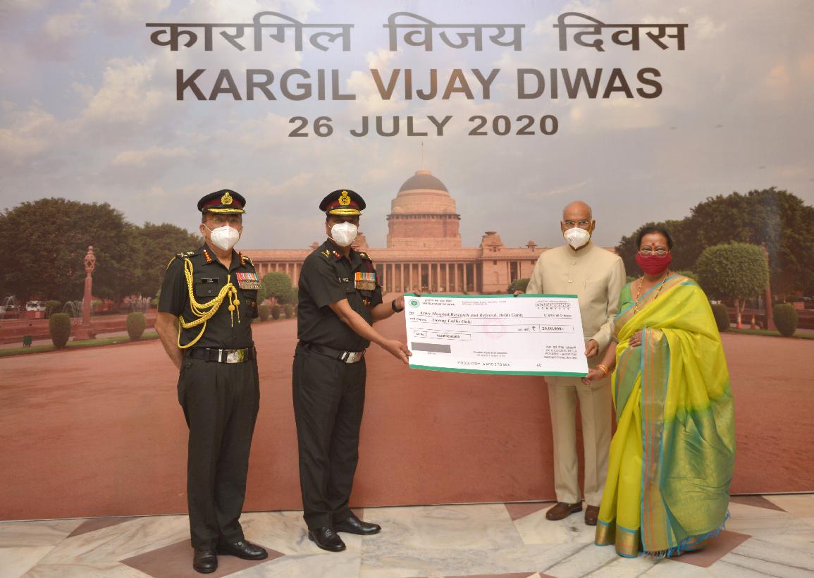 | Caption: | The President of India, Shri Ram Nath Kovind presenting a cheque of Rs 20 lakh to the Army Hospital (Research and Referral), Delhi to buy equipment to combat the Covid-19 pandemic on the 21st anniversary of Vijay Diwas, at Rashtrapati Bhavan on July 26, 2020. |