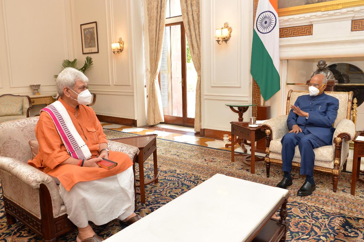 | Caption: | The Lt. Governor of Jammu and Kashmir, Shri Manoj Sinha calling on the President of India, Shri Ram Nath Kovind, at Rashtrapati Bhavan on August 10, 2020. |