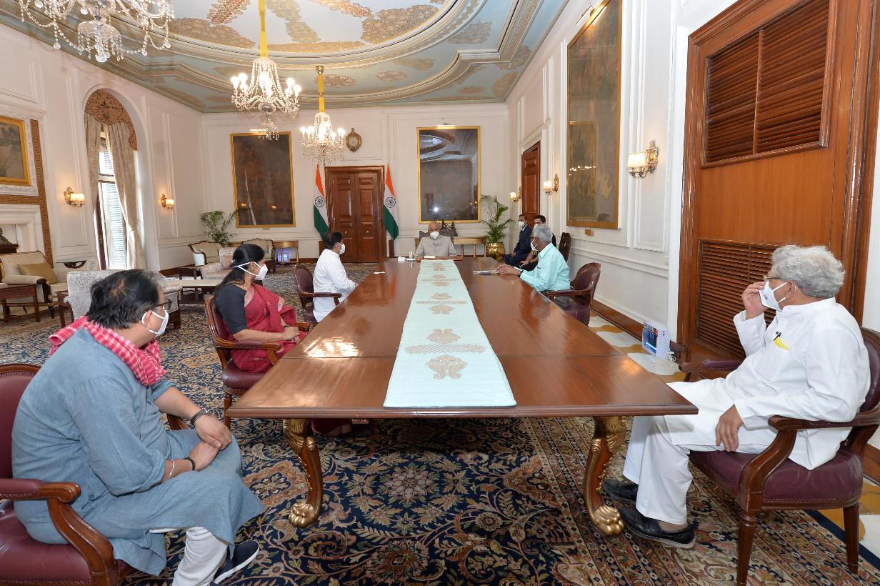 | Caption: | A delegation comprising Shri D. Raja, General Secretary, CPI & Ex-MP (RS), Shri Ahmed Patel, MP (RS), Shri Sitaram Yechury, General Secretary, CPI (M) & Ex-MP (RS), Ms. Kanimozhi, MP (LS) and Prof. Manoj Jha, MP (RS) calling on the President of India, Shri Ram Nath Kovind, at Rashtrapati Bhavan on September 17, 2020. |