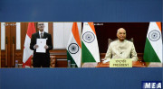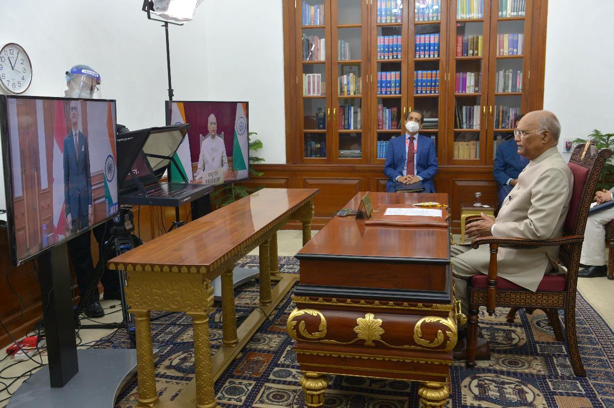 | Caption: | The President of India, Shri Ram Nath Kovind receives credentials from H.E. Dr. Ralf Heckner, Ambassador-designate of Switzerland to India, through video conferencing, at Rashtrapati Bhavan on October 14, 2020. |