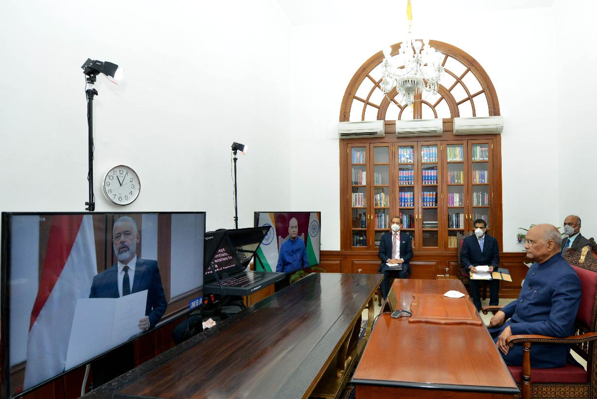 | Caption: | The President of India, Shri Ram Nath Kovind accepting credentials from the Ambassador-designate of Hungary, H.E. Mr. Andras Laszlo Kiraly, in a virtual ceremony, at Rashtrapati Bhavan on November 20, 2020. |