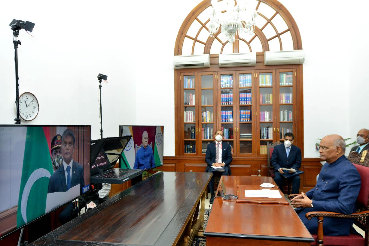 | Caption: | The President of India, Shri Ram Nath Kovind accepting credentials from the High Commissioner of Maldives, H.E. Dr. Hussain Niyaaz, in a virtual ceremony, at Rashtrapati Bhavan on November 20, 2020. |