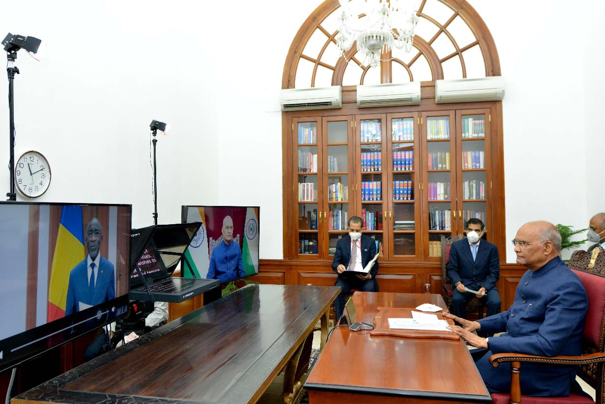 | Caption: | The President of India, Shri Ram Nath Kovind accepting credentials from the Ambassador-designate of Chad, H.E. Mr. Soungui Ahmed, in a virtual ceremony, at Rashtrapati Bhavan on November 20, 2020. |