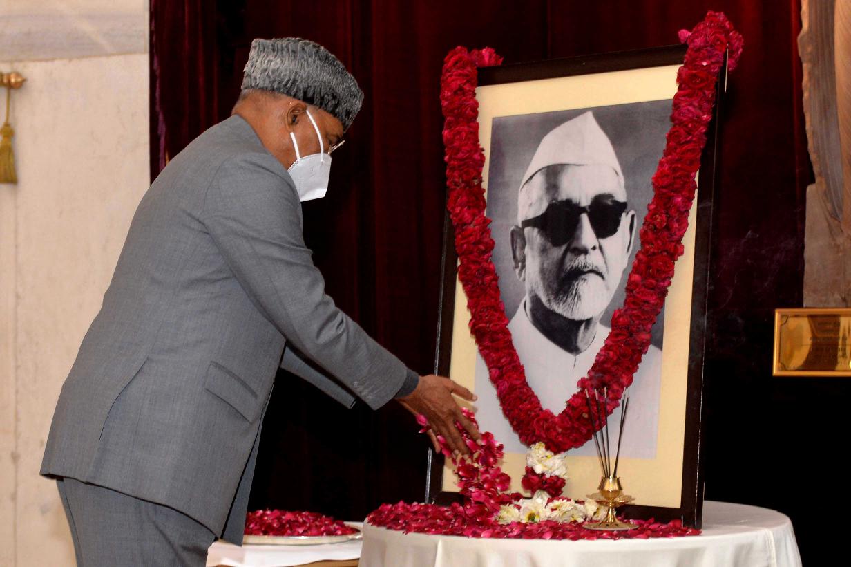 | Caption: | The President of India, Shri Ram Nath Kovind paying floral tributes to Dr. Zakir Hussain, former President of India, on his birth anniversary, at Rashtrapati Bhavan on February 08, 2021. |