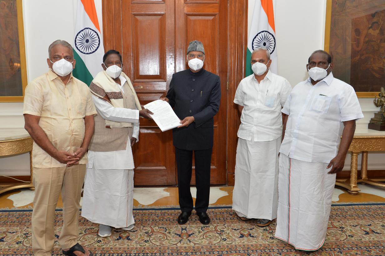 | Caption: | The Chief Minister of Puducherry, Shri V. Narayanasamy along with Ministers and MP from Puducherry calling on the President of India, Shri Ram Nath Kovind, at Rashtrapati Bhavan on February 10, 2021. |