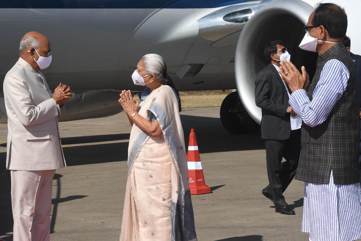 | Caption: | The President of India, Shri Ram Nath Kovind being received by the Governor of Madhya Pradesh, Smt. Anandiben Patel and the Chief Minister of Madhya Pradesh, Shri Shivraj Singh Chouhan, on his arrival, at Jabalpur airport, in Madhya Pradesh on March 06, 2021. |