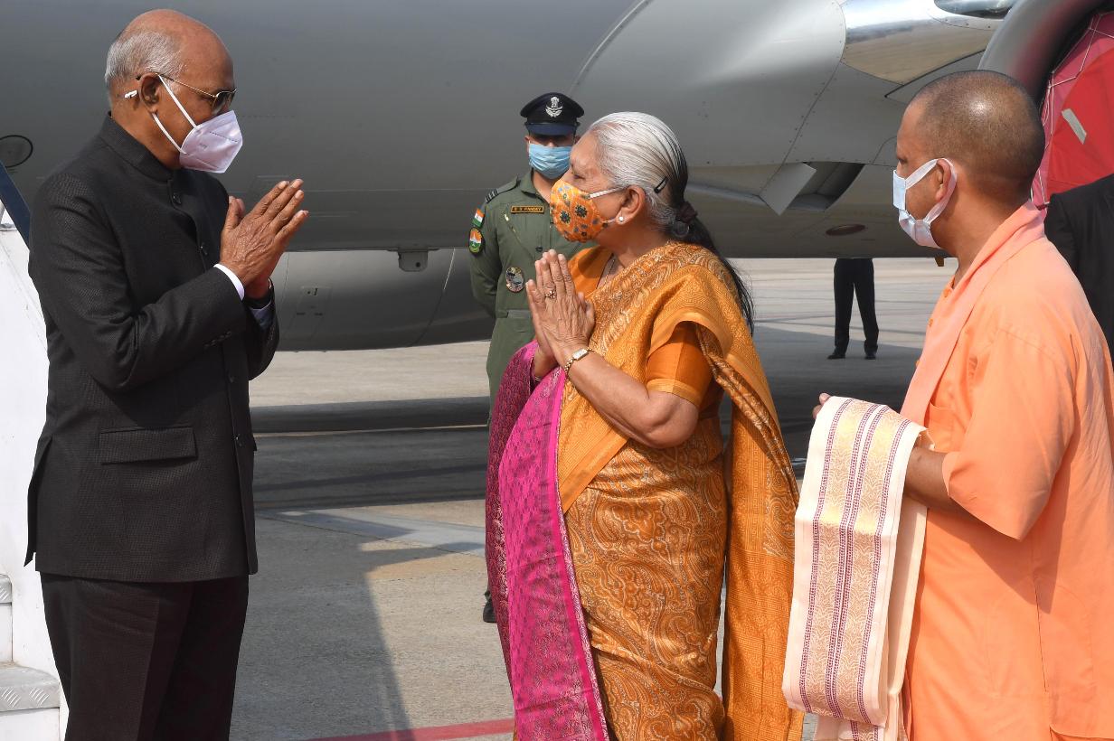 | Caption: | The President of India, Shri Ram Nath Kovind being received by the Governor of Uttar Pradesh, Smt. Anandiben Patel and the Chief Minister of Uttar Pradesh, Shri Yogi Adityanath, on his arrival, at Varanasi, in Uttar Pradesh on March 13, 2021. |