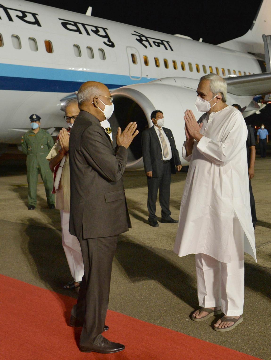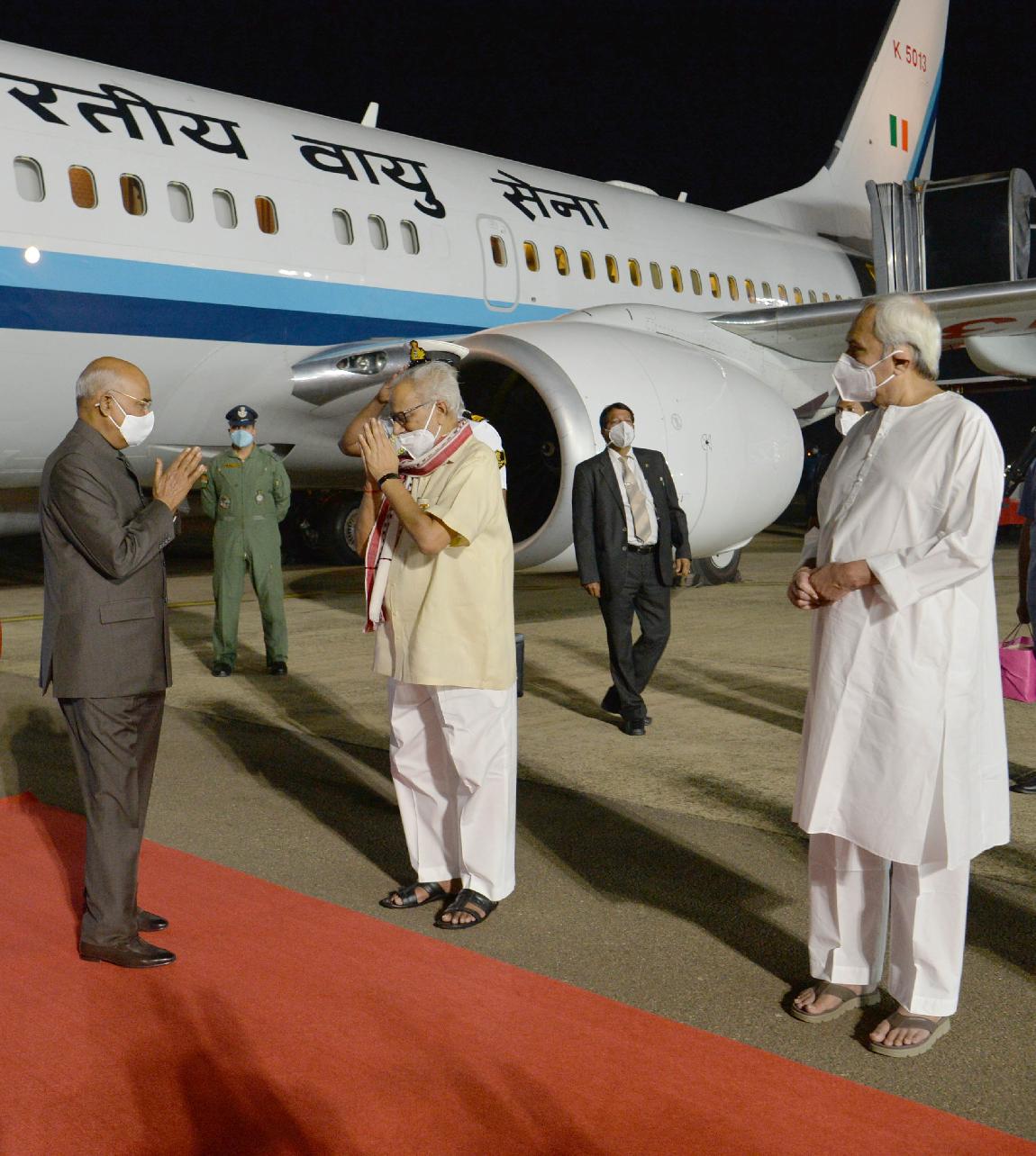 | Caption: | The President of India, Shri Ram Nath Kovind being received by the Governor of Odisha, Prof. Ganeshi Lal and the Chief Minister of Odisha, Shri Naveen Patnaik, on his arrival, at Bhubaneswar, Odisha on March 20, 2021. |