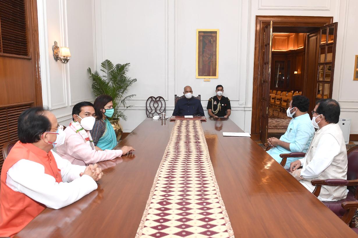 | Caption: | The Minister of Culture, Tourism and Development of North Eastern Region, Shri G. Kishan Reddy along with the Ministers of State for Tourism, Shri Shripad Yesso Naik & Shri Ajay Bhatt, the Minister of State for Culture, Smt. Meenakshi Lekhi and the Minister of State for Development of North Eastern Region, Shri B.L. Verma calling on the President of India, Shri Ram Nath Kovind, at Rashtrapati Bhavan on July 20, 2021. |
