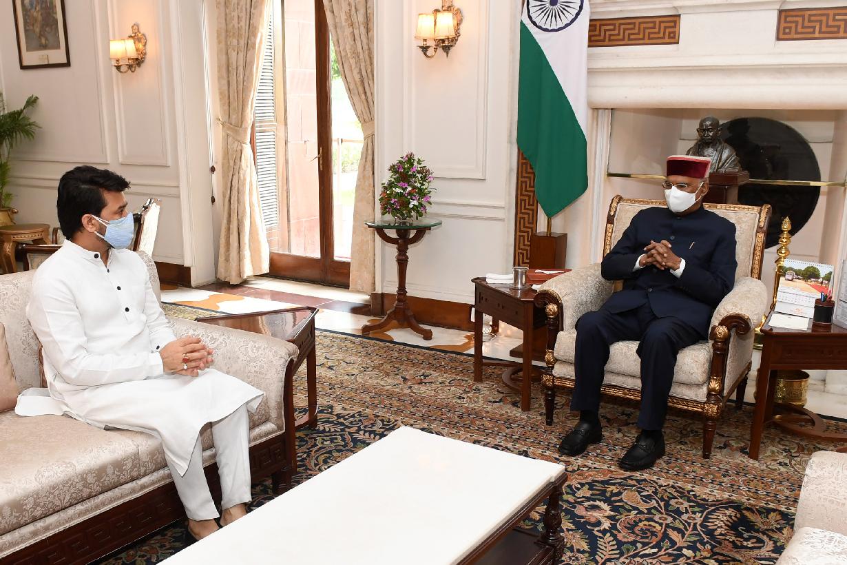 | Caption: | The Union Minister of Information & Broadcasting and Youth Affairs & Sports, Shri Anurag Singh Thakur calling on the President of India, Shri Ram Nath Kovind, at Rashtrapati Bhavan on July 20, 2021. |