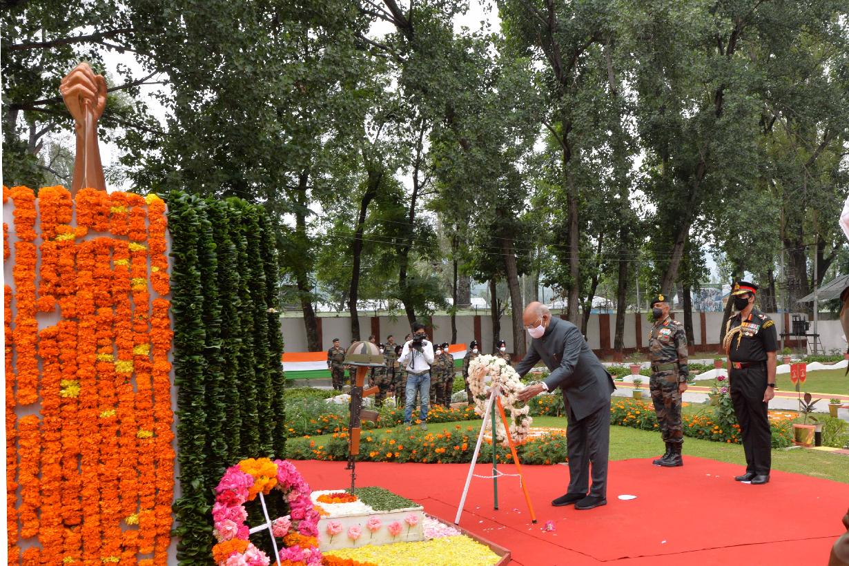 | Caption: | The President of India, Shri Ram Nath Kovind laid a wreath at the Dagger War Memorial to pay tributes to all soldiers who sacrificed their lives in defending the nation, at Baramulla, in Jammu & Kashmir on July 26, 2021. |