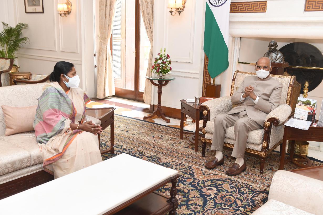 | Caption: | The Minister of State for Social Justice and Empowerment, Sushri Pratima Bhoumik calling on the President of India, Shri Ram Nath Kovind, at Rashtrapati Bhavan on July 30, 2021. |