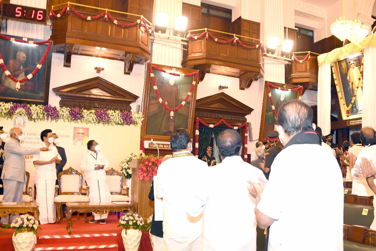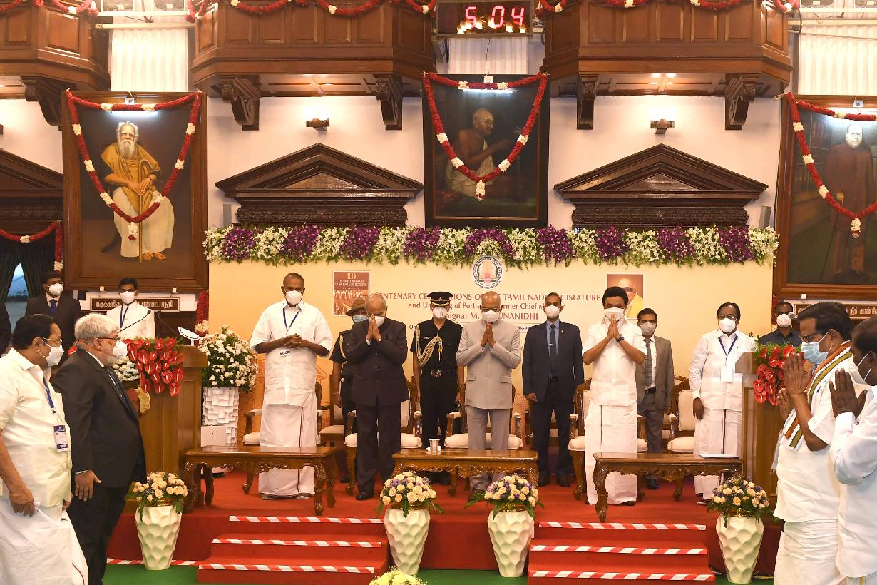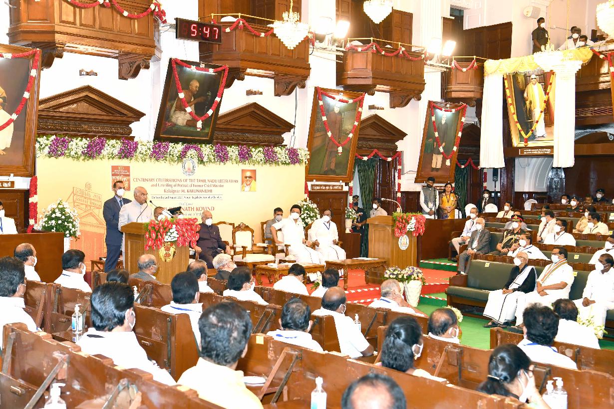 | Caption: | The President of India, Shri Ram Nath Kovind addressing the commemoration of the 100th year of the Madras Legislative Council and unveiling a portrait of the former Chief Minister of Tamil Nadu, Kalaignar M. Karunanidhi in the Legislative Assembly of Tamil Nadu on August 02, 2021. |