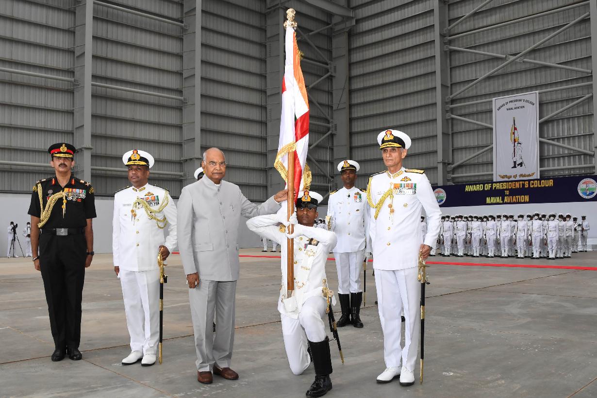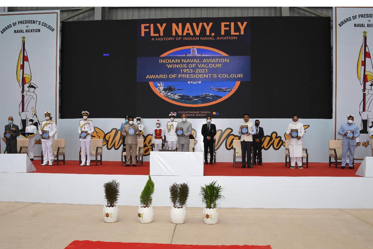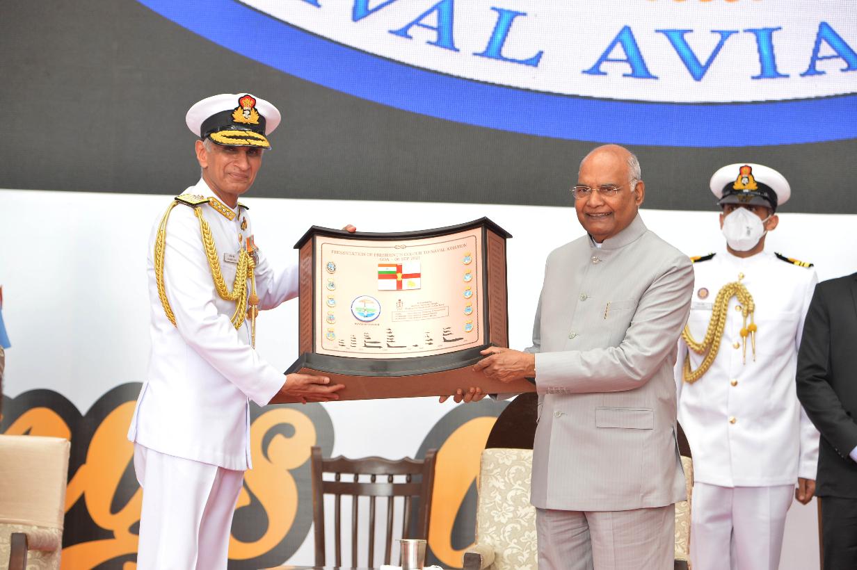 | Caption: | The President of India, Shri Ram Nath Kovind presenting President s Colour to the Indian Naval Aviation, at INS Hansa, in Goa on September 06, 2021. |